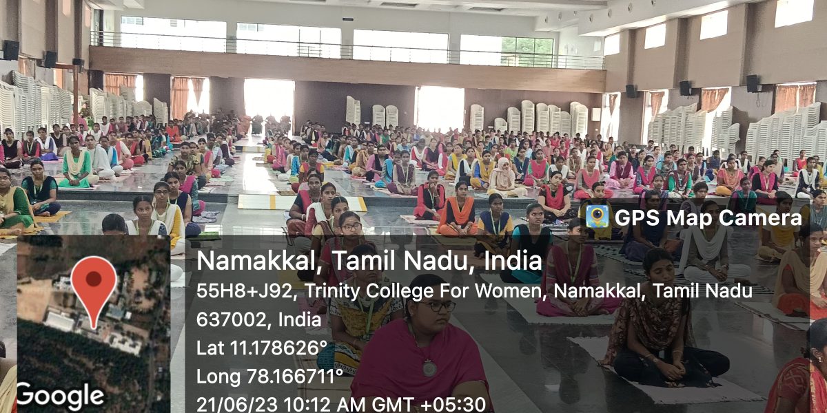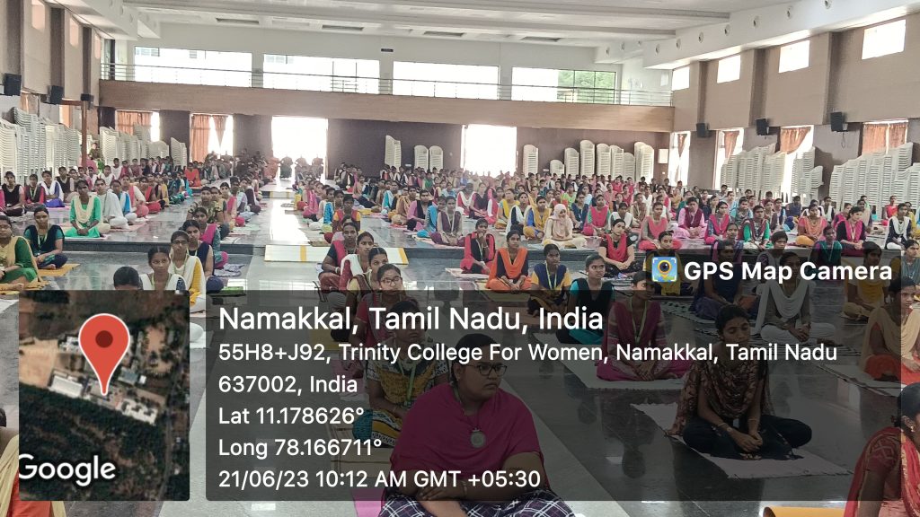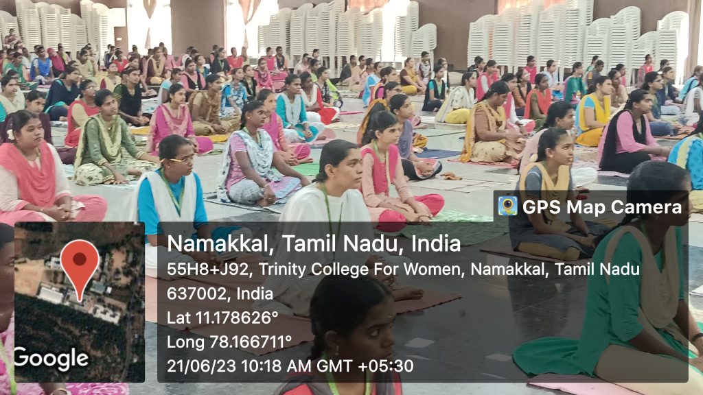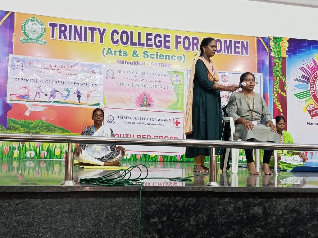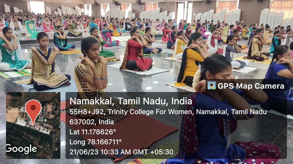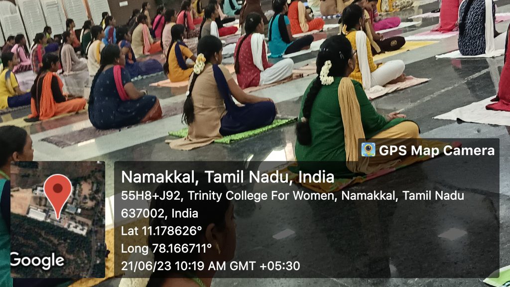 On behalf of the Yoga and Meditation Club, in association with the Department of Physical Education and the support of the National Service Scheme and Youth Red Cross, Trinity College for Women, Namakkal conducted a yoga programme under the title of “Yoga and Meditation for Stress Relief” on 21st June 2023.