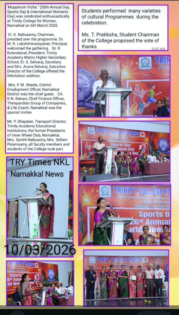 Trinity College for Women, Namakkal, enthusiastically celebrated “Mupperum Vizha” (26th Annual Day, Sports Day and International Women’s Day) on 6th March 2026 in the Trinity Auditorium.