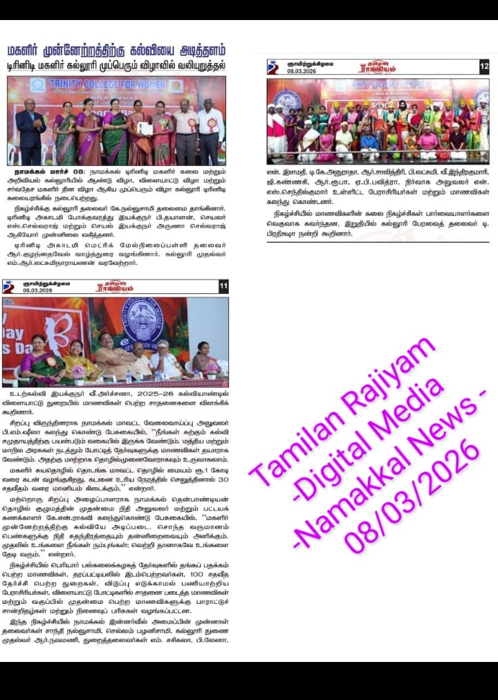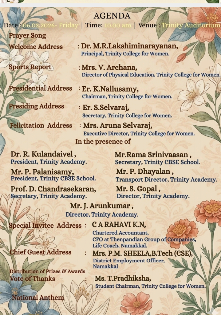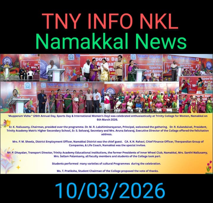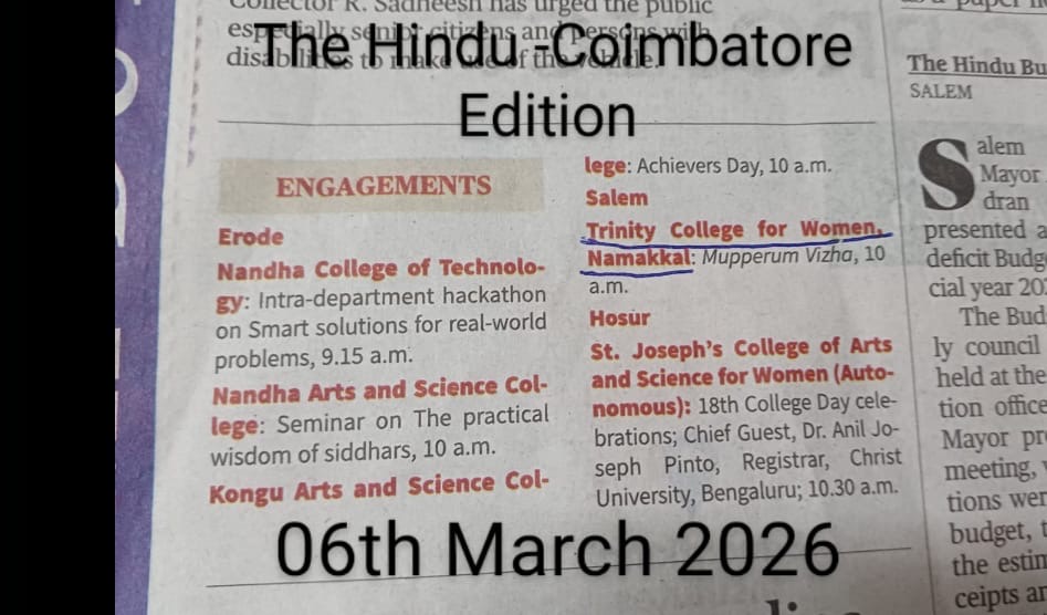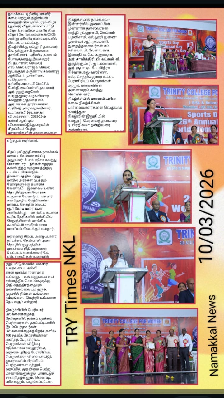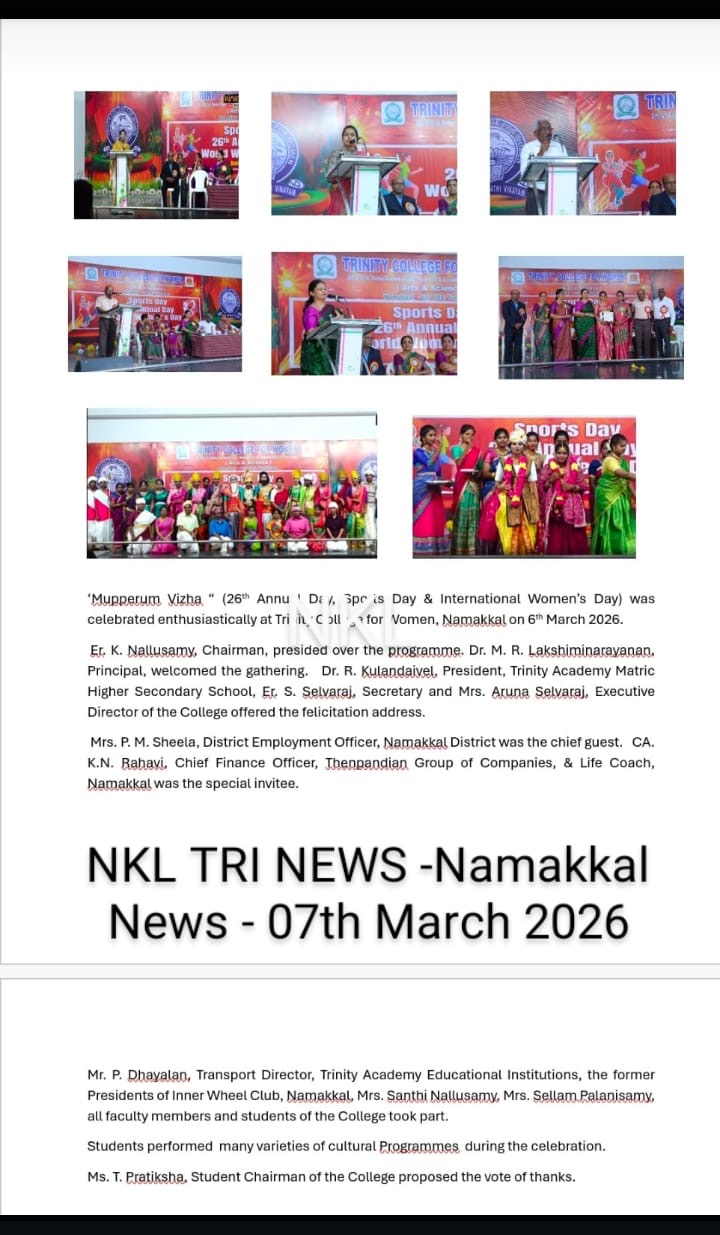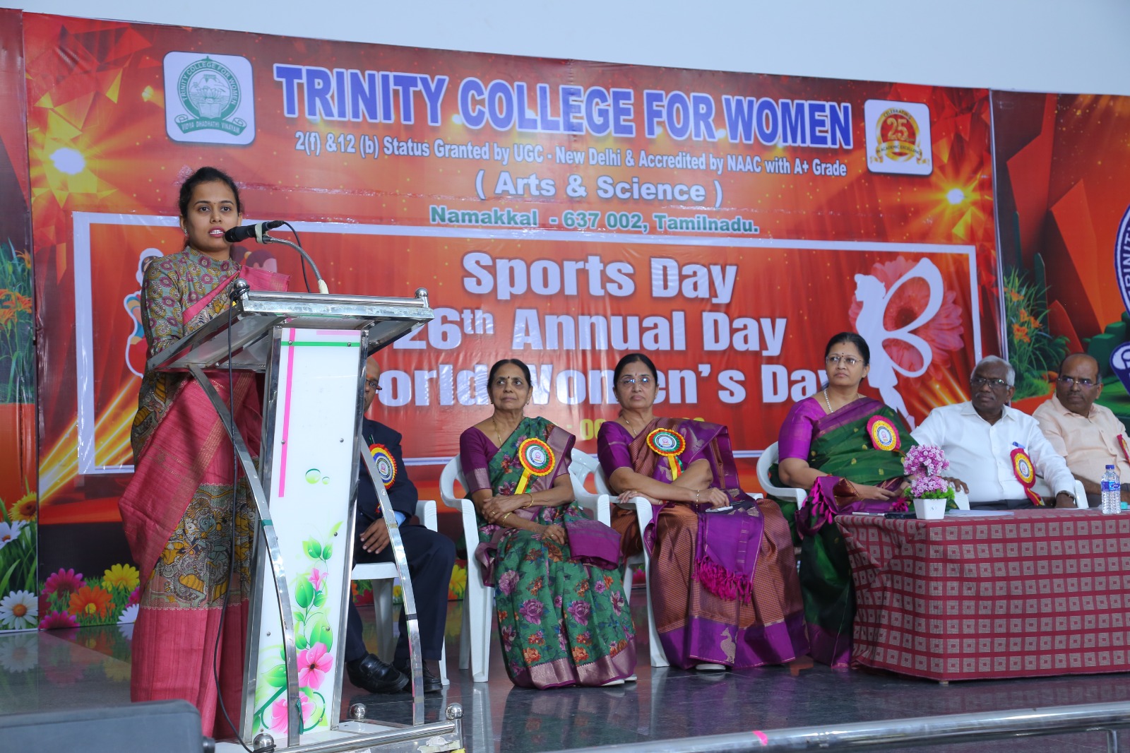 Trinity College for Women, Namakkal, enthusiastically celebrated “Mupperum Vizha” (26th Annual Day, Sports Day and International Women’s Day) on 6th March 2026 in the Trinity Auditorium.
