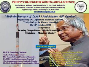Owing to the birth anniversary of former President of India Dr. A.P.J. Abdul Kalam, the department of Physics and Internal Quality Assurance Cell of Trinity College for Women, Namakkal organized the following competitions on 14.10.2022.