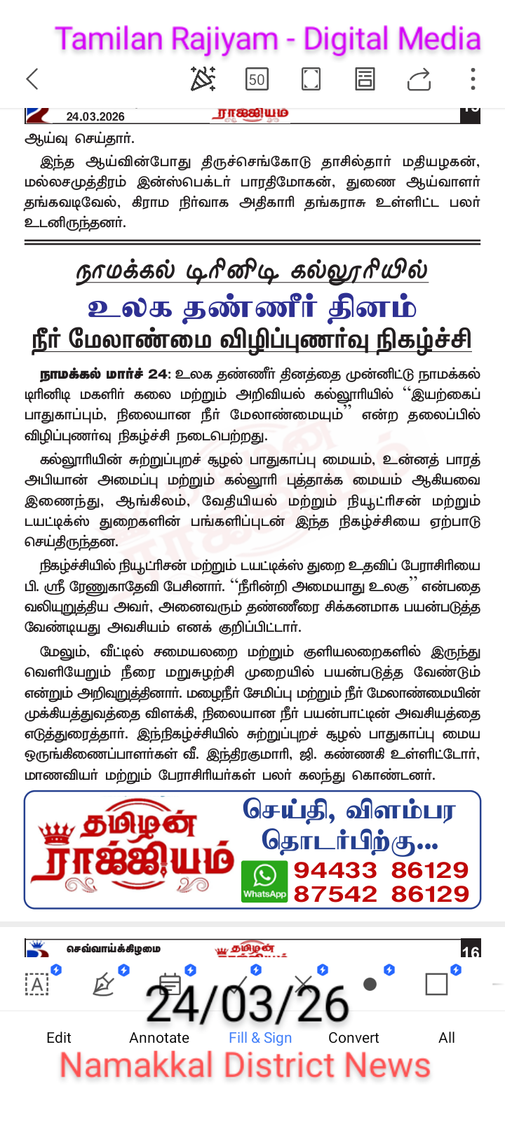 Owing to the observation of World Water Day (22nd March), the Eco Green Club, in association with the Institution’s Innovation Council & Unnat Bharat Abhiyan Cell, and with the support of the Departments of English, Chemistry, and Nutrition & Dietetics, Trinity College for Women, Namakkal, organized an awareness program titled “Nature’s Growth and Sustainable Water Management” on 22nd March 2026.