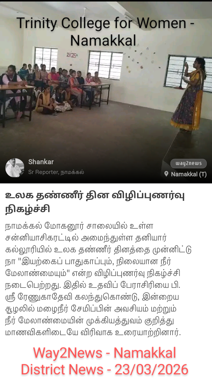 Owing to the observation of World Water Day (22nd March), the Eco Green Club, in association with the Institution’s Innovation Council & Unnat Bharat Abhiyan Cell, and with the support of the Departments of English, Chemistry, and Nutrition & Dietetics, Trinity College for Women, Namakkal, organized an awareness program titled “Nature’s Growth and Sustainable Water Management” on 22nd March 2026.