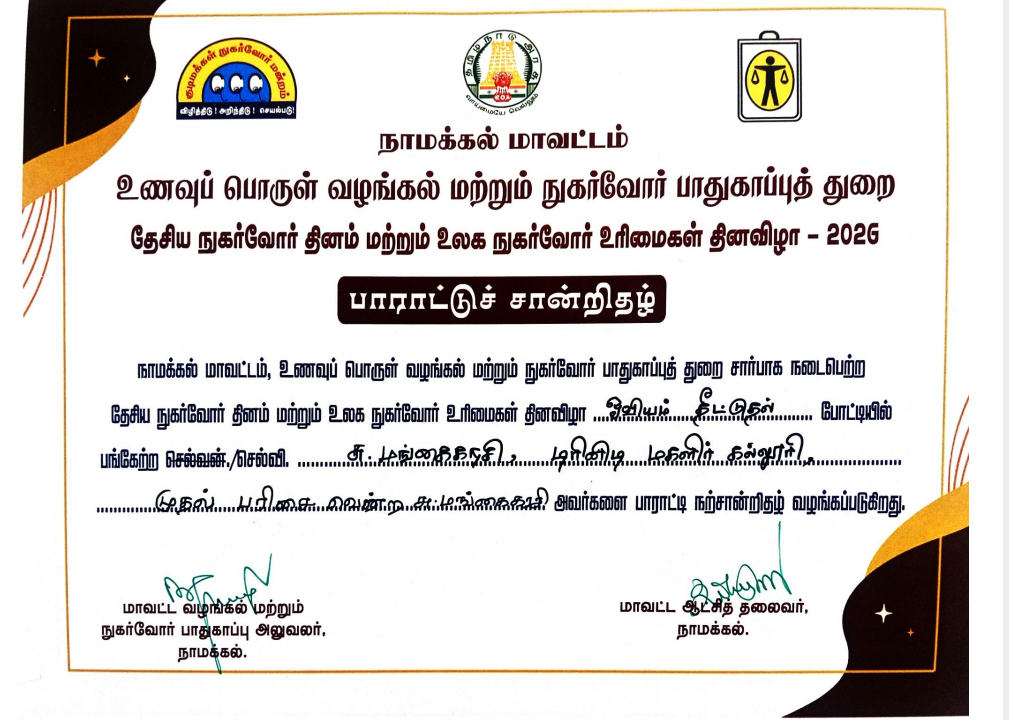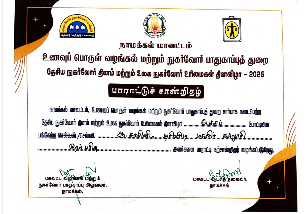 Due to National Consumer Day and World Consumer Rights Day (March 15th), The Department of Civil Supplies & Consumer Protection, Namakkal District, organized “Citizen Consumer Competitions’ on 13th March 2026. It was held on the premises of District Collector Office, Namakkal.