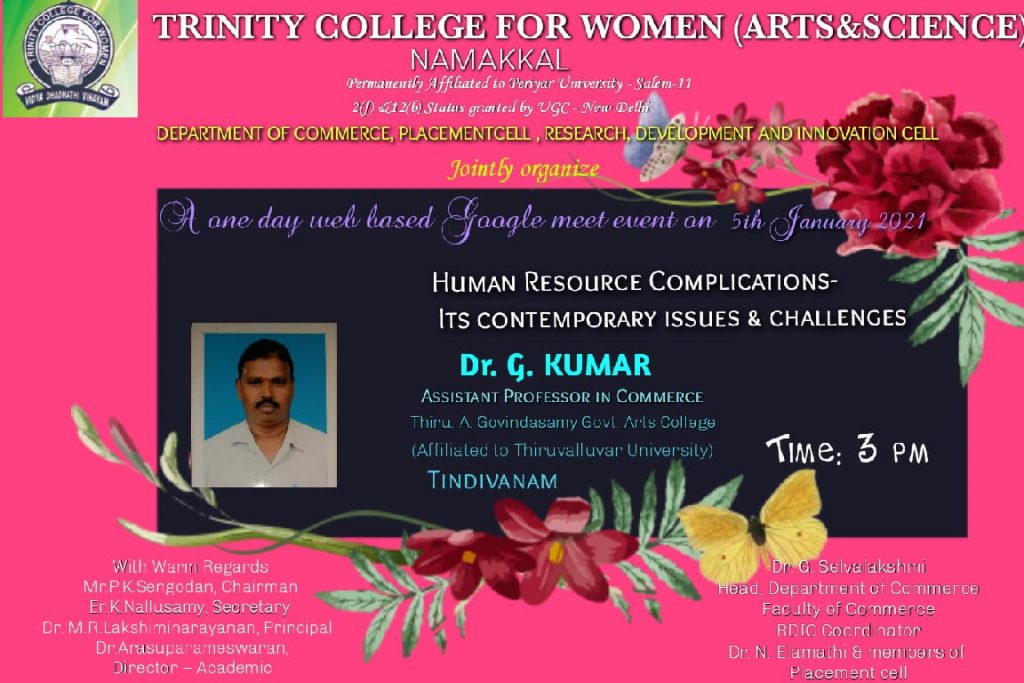 Our College department of Commerce, Placement Cell and Research, Development & Innovative Cell jointly organized a one day web based Google Meet Event entitled “Human Resource Complications – Its Contemporary Issues and Challenges” on 5th January 2021 (Tuesday) at 3 PM.