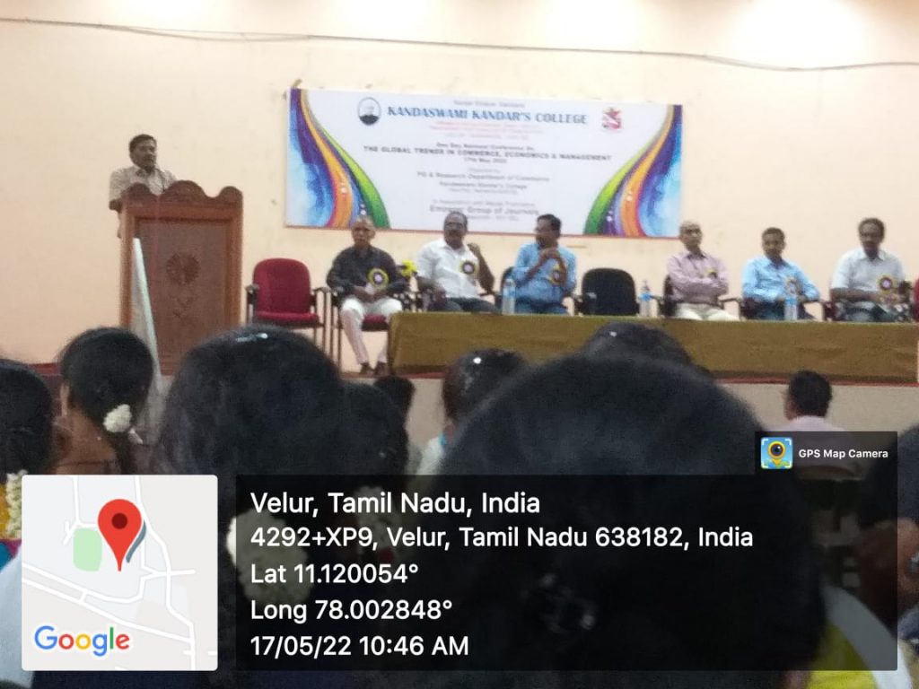 The Post Graduate and Research Department of Commerce, Kandaswami Kandar’s College, Paramathi-Velur, Namakkal district in association with MAYAS Publications, Kancheepuram organized a one day national conference entitled “The Global Trends in Commerce, Economics and Management” on 17th May 2022. Dr. R. Somasundaram, President & Secretary, Kandaswami Kandar’s Educational Institutions, Paramathi-Velur, Namakkal District presided over the conference. Dr. R. Mayakkannan, Assistant Professor in Commerce, Sri Sankara Arts and Science College, Enathur, Kancheepuram offered his felicitation address.