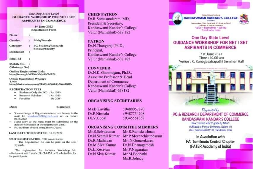 The Post Graduate and Research Department of Commerce, Kandaswami Kandar’s College, Paramathi-Velur, Namakkal District organized a “one day state level workshop for NET/SET aspirants in Commerce” on 1st June 2022