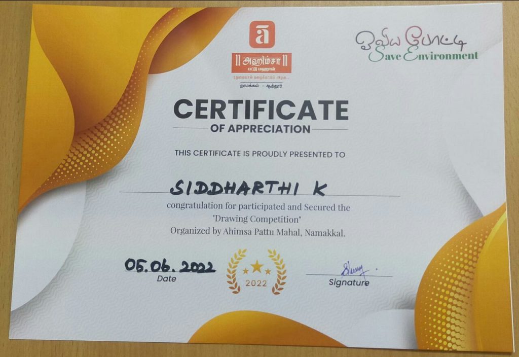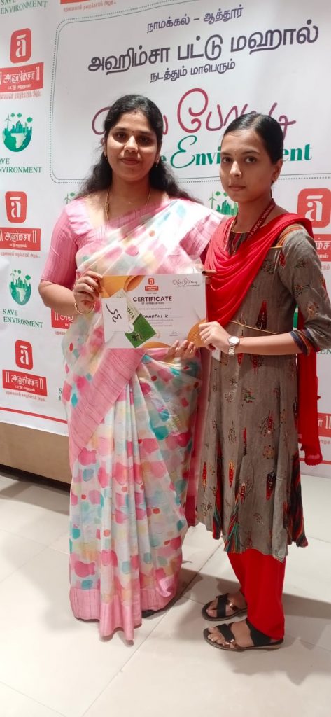 Apart from Ms. K. Siddharthi, got a third place in drawing competition in the title of “Save Environment” (சுற்றுச்சூழலை பாதுகாப்போம்). This event was organized by “Ahimsa Pattu Mahal, Salem Road, Namakkal.