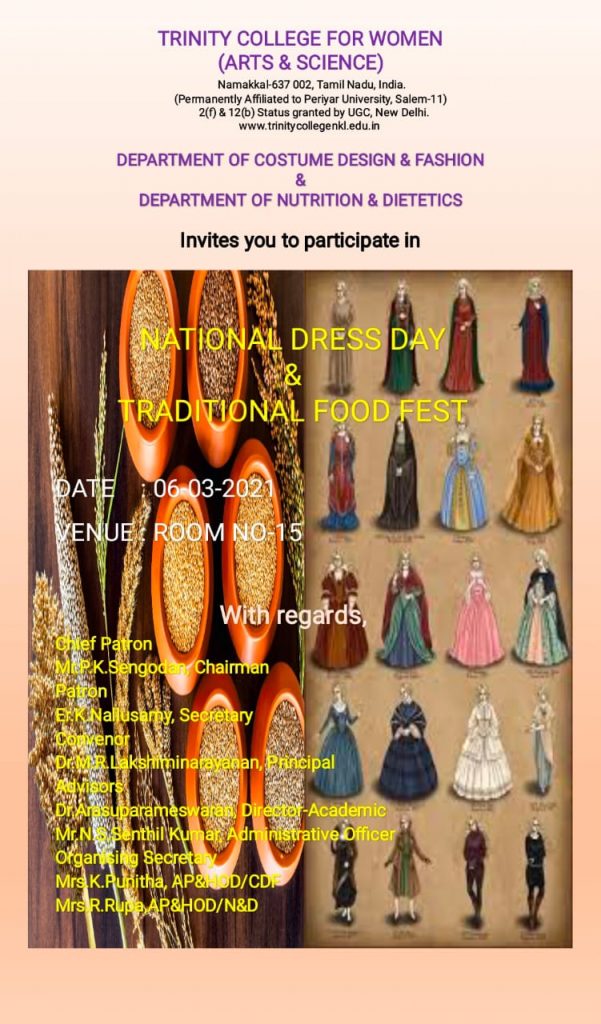 Owing to National Dress Day (06.03.2021), our College department of Costume Design and Fashion & Department of Nutrition and Dietetics jointly conducted a one day event titled “Jollification of National Dress Day & Traditional Food Fest” on 6th March 2021 in our College campus.
