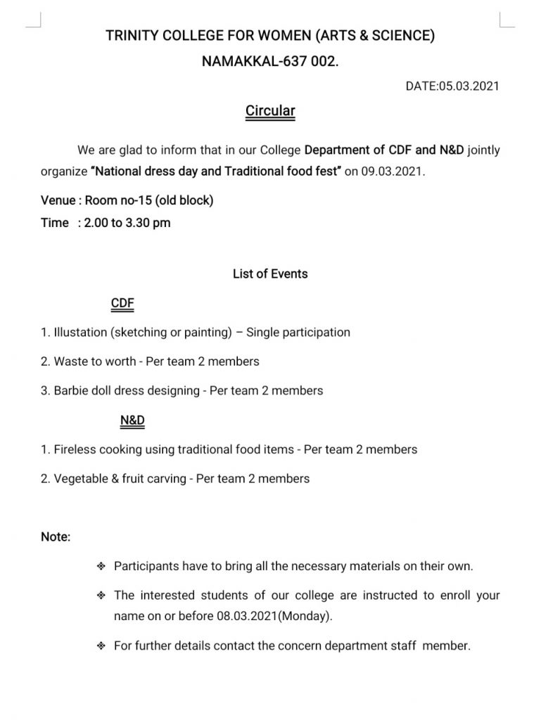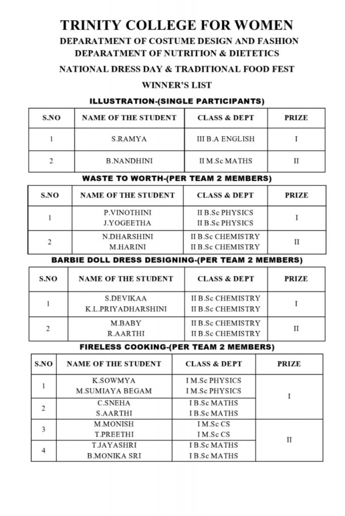 More or less 100 students of various courses enthusiastically participated in those events.     Mrs. K Punitha, Assistant Professor and Head, Department of Costume Design and Fashion and Mrs. R. Rupa, Assistant Professor and Head, Department of Nutrition and Dietetics have made arrangements in those events.