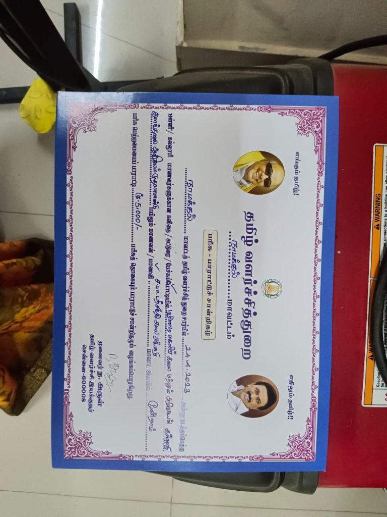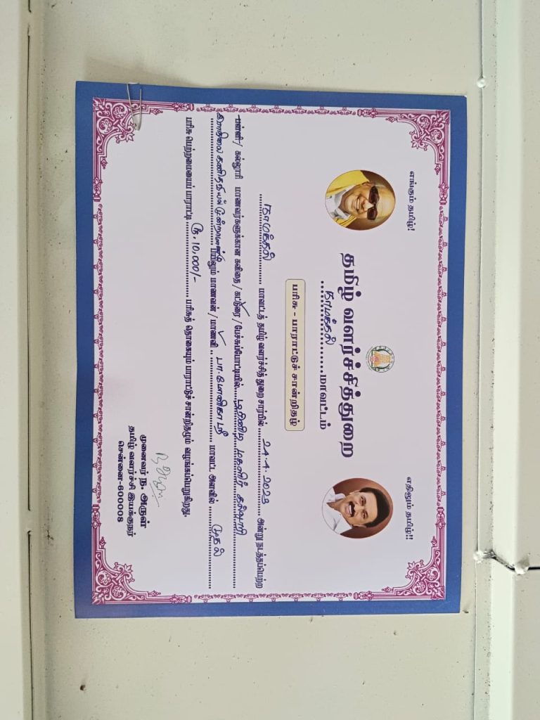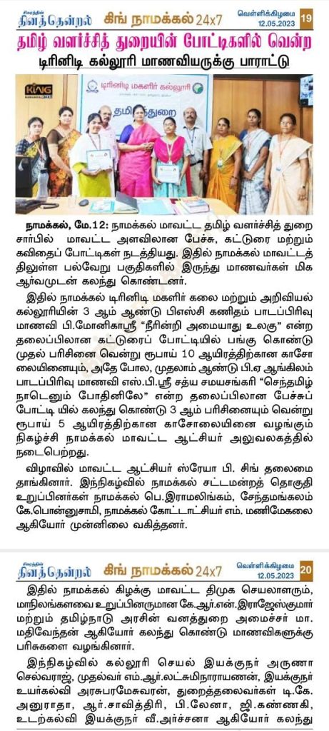 On 24th April 2023, the Department of Tamil Development, Namakkal conducted the Namakkal district level elocution, essay writing and lyrics competitions in the venue of Namakkal Kavignar Ramalingam Government Arts College for Women, Namakkal.