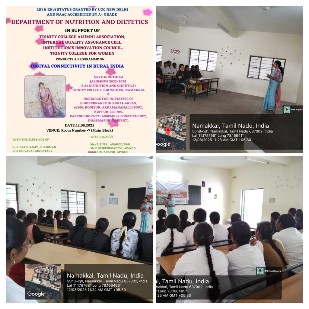 The Department of Nutrition and Dietetics, in support of Trinity College Alumni Association, Internal Quality Assurance Cell and Institutions’ Innovation Council, Trinity College for Women, Namakkal conducted a programme entitled “Digital connectivity in rural India” on 12th August 2025 in the College campus.