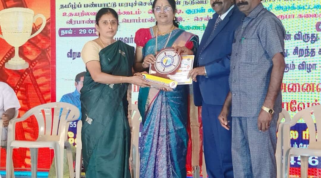 She got an award of “Thamil valartha Sandror Silamboli Sellappanar Virudhu” (தமிழ் வளர்த்த சான்றோர் சிலம்பொலி செல்லப்பனார் விருது) from the chief guest Dr M. Krishnan, Honourable Vice Chancellor of Tamil Nadu Central University, Thiruvarur.