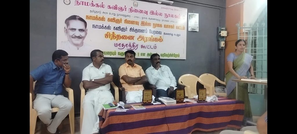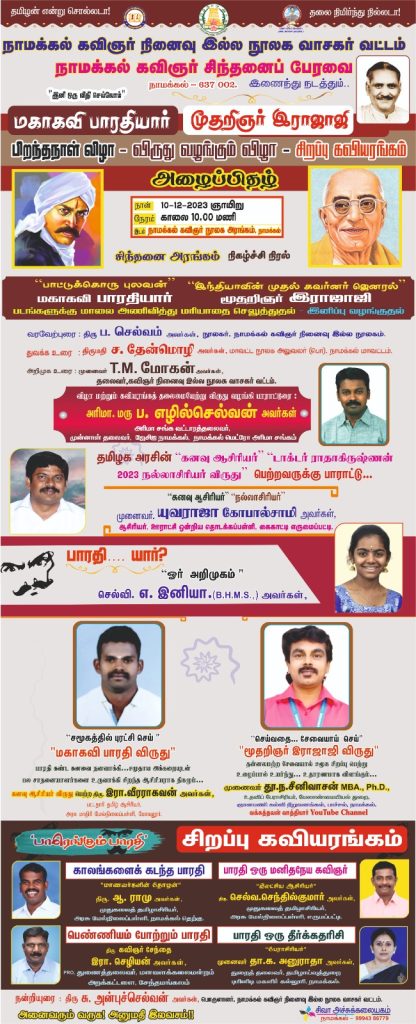 Namakkal Kavignar Memorial Library Readers Circle (நாமக்கல் கவிஞர் நினைவு இல்ல நூலக வாசகர் வட்டம்) and Namakkal Kavignar Thinkers Federation – (நாமக்கல் கவிஞர் சிந்தனை பேரவை) jointly celebrated the birth anniversary of Mahakavi Bharathi and Mootharignar Rajaji on December 10, 2023, in the venue of Namakkal Kavignar Library Hall, Namakkal.