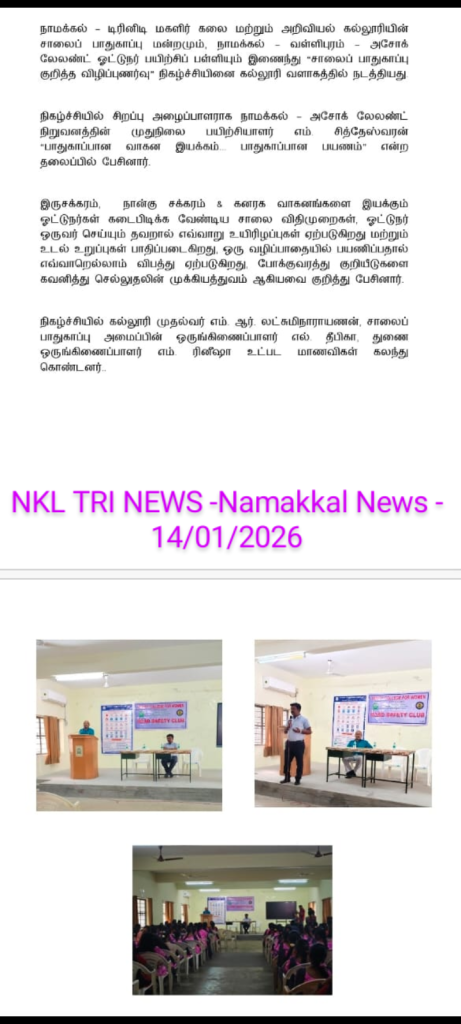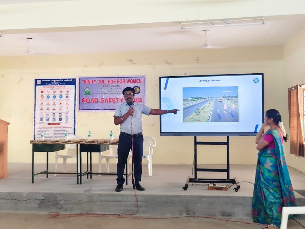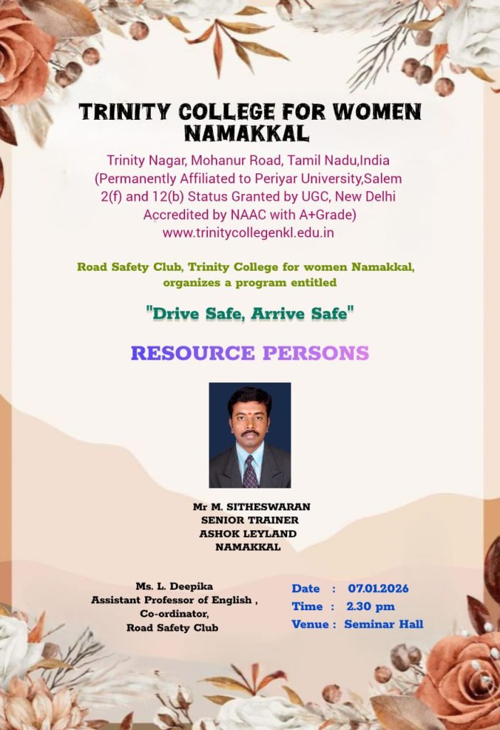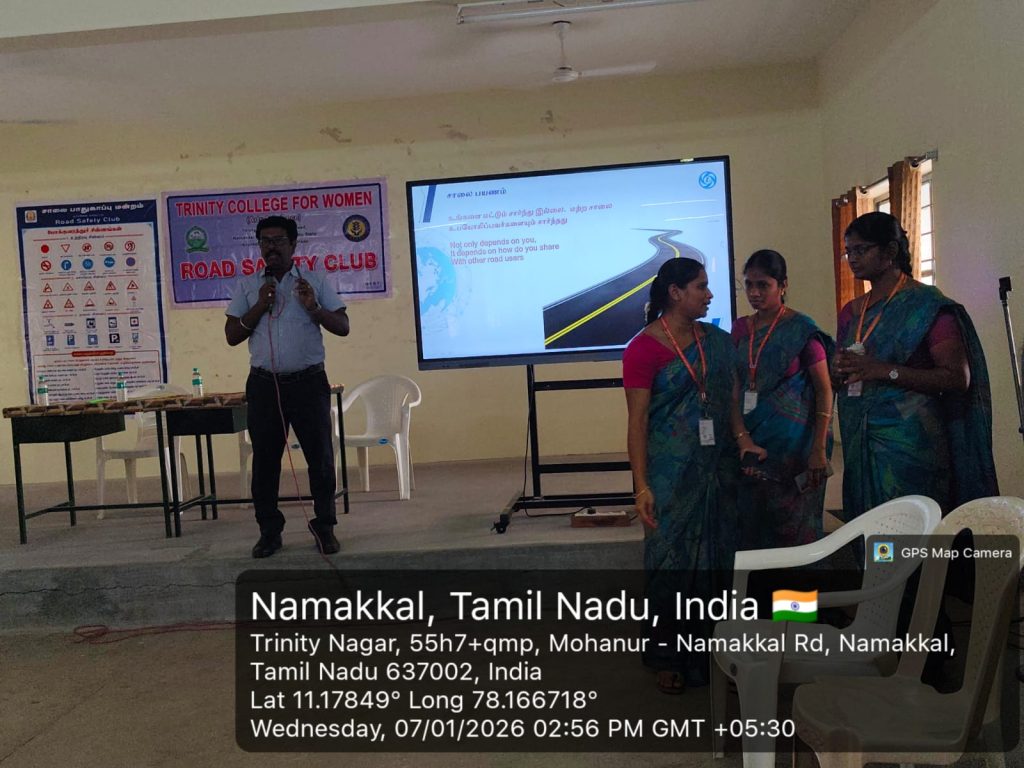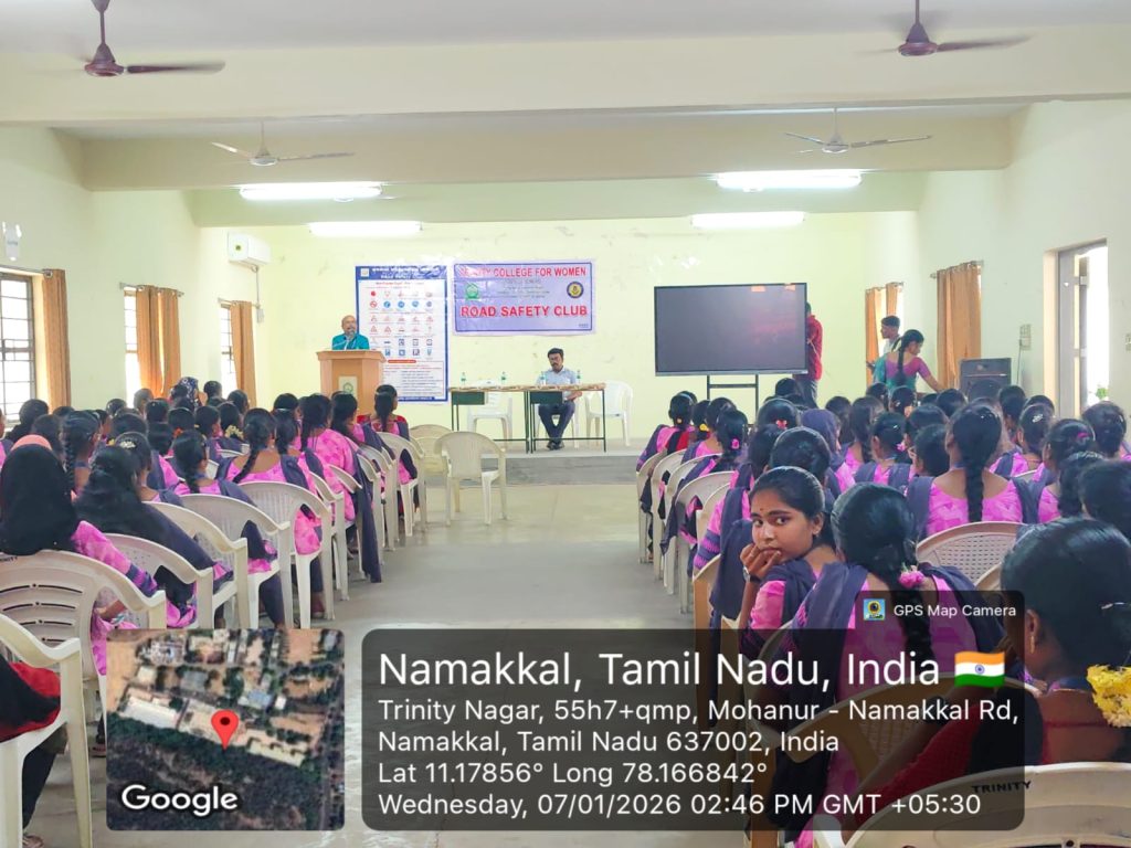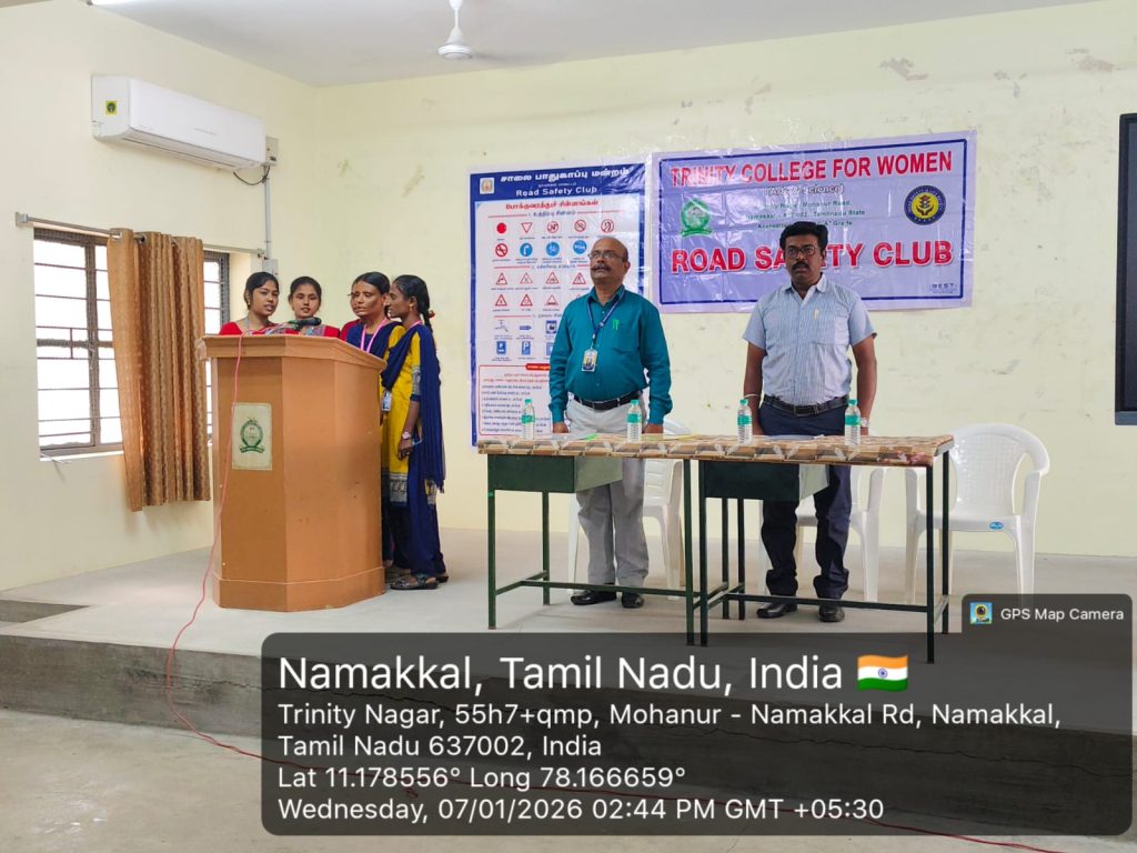 Due to National Road Safety Month (01st January 2026 to 31st January 2026), The Road Safety Club, Trinity College for Women, Namakkal, organized a “Road Safety Awareness” Programme titled “Drive Safe…. Arrive Safe” on 07th January 2026 on the College premises. The theme of the Programme – “Road Safety, Save Lives” (Sadak Suraksha Jeevan Raksha).