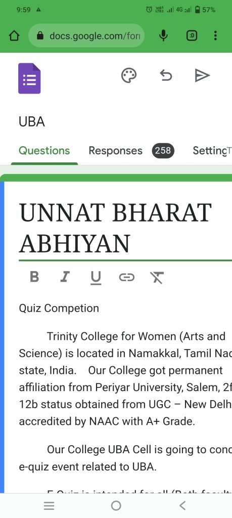 The Unnat Bharat Abhiyan Cell, Trinity College for Women, Namakkal, Tamil Nadu state conducted an e-quiz programme related to UBA for faculty and students from 30.05.2023 onwards.