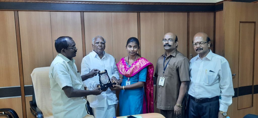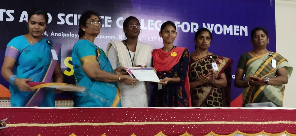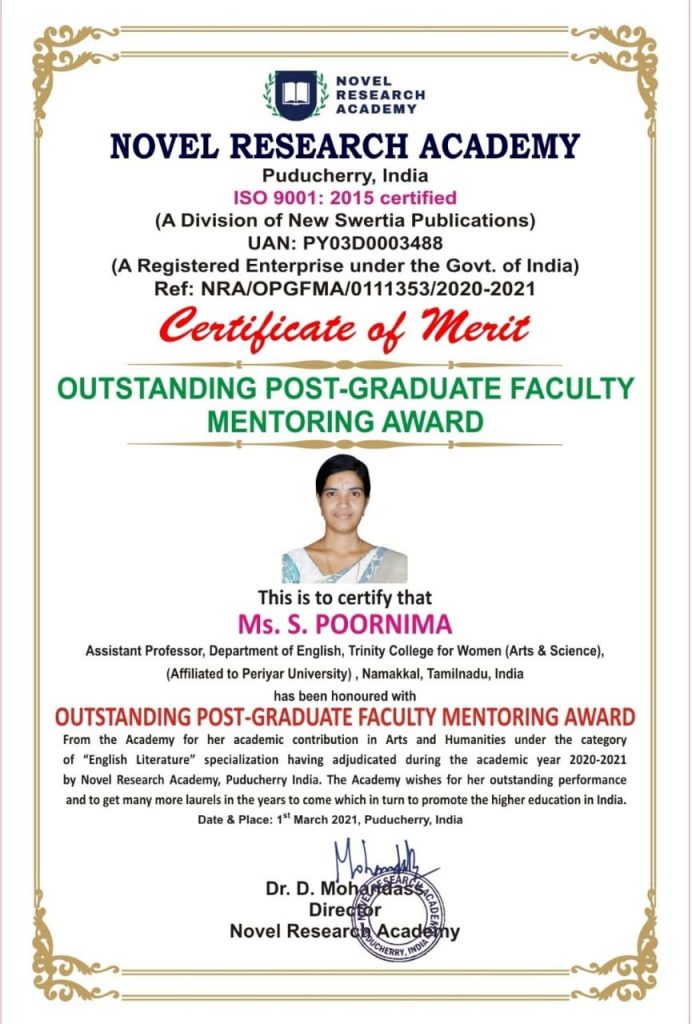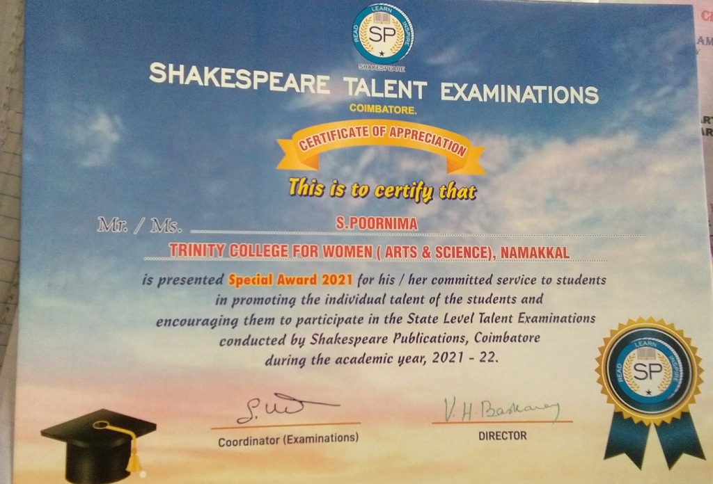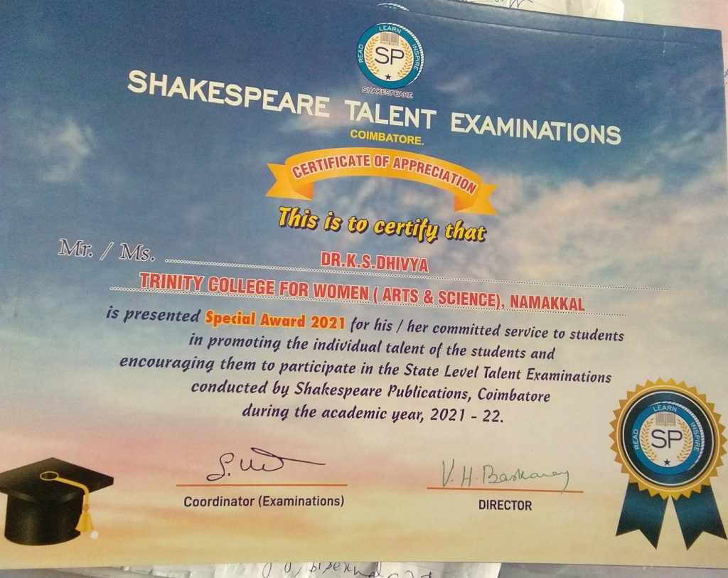 In addition, Dr. K.S. Dhivya, Assistant Professor and Head, Post Graduate Department of English & Ms. S. Poornima, Assistant Professor in English obtained a special award 2021 for their committed service to students in promoting the individual talent of the students and encouraging them to participate in the state level talent examinations conducted by Shakespeare Publications, Coiumbatore during the academic year 2021-22.