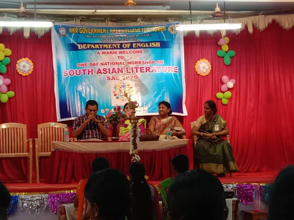 · The Department of English, Namakkal Kavingnar Ramalingam Government Arts College for Women, Namakkal organized a one day national level workshop entitled “South Asian Literature” (SAL) on 6th March 2020 in the College campus. Dr. K. Suguna, Principal of the College presided over the workshop. Dr.N. Subbalakshmi, HOD of English welcomed the gathering. Dr. Vijayakumar M. Boratti, Assistant Professor in English, University of Mysore Evening College, Mysore and Ms. S Yasmin, HOD of English, Kongu Arts and Science College, Erode were the resource persons. Dr. T. Latha, Assistant Professor of English delivered the vote of thanks. In this regard, the following faculty members and students of English of our College took part.