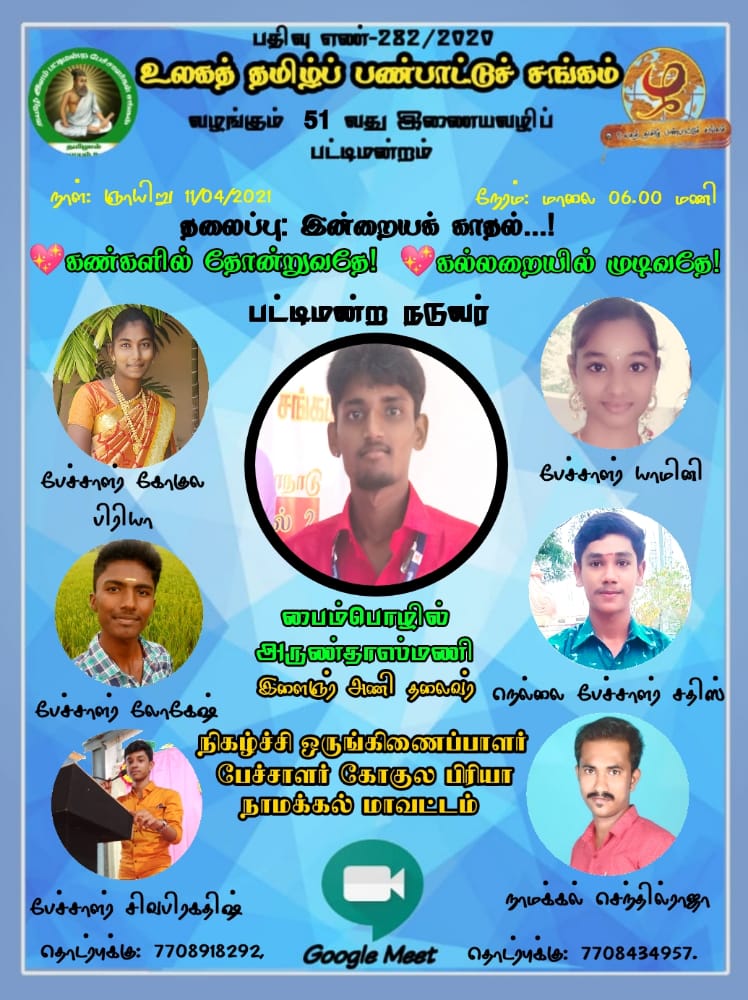 The World Tamil Cultural Association (உலகத் தமிழ் பண்பாட்டுக் கழகம்) organized 51st online debate event in the title of “Today’s love – Show up in the eyes or come to an end in graveyard” (இன்றைய காதல் – கண்களில் தோன்றுவதே! அல்லது கல்லறையில் முடிவதே!) on 11th April 2021 in the mode of Google Meet. In this regard, Ms.A. Gokulapriya, II B.A., English of our College delivered on the topic of “Today’s love – show up in the eyes. She spoke very well.