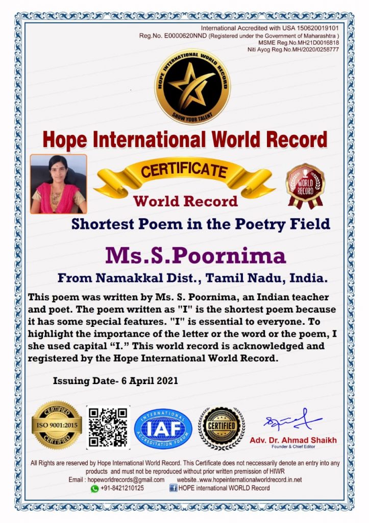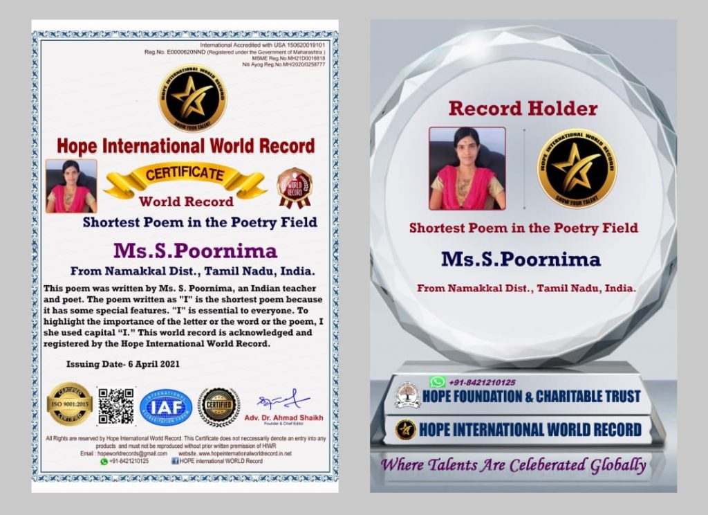 | 04 | Shortest Poem in the Poetry Field | 06.04.2021 | HOPE International World Record, Maharashtra | She has written a poem by using a single alphabet of “I” and proved it as an International World Record – 2021 |