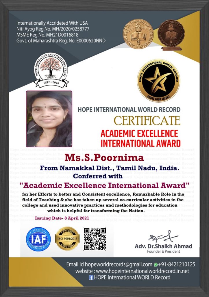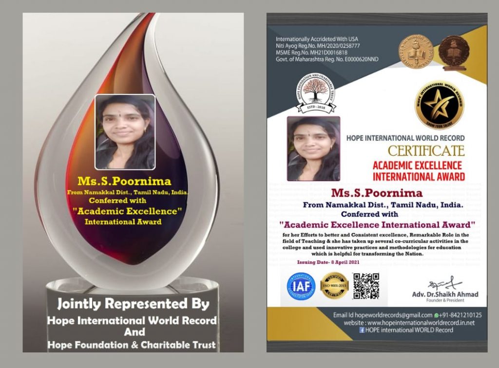 | 03 | Academic Excellence International Award | 08.04.2021 | International Accreditation Forum & HOPE International World Record, Maharashtra | For her academic excellence |