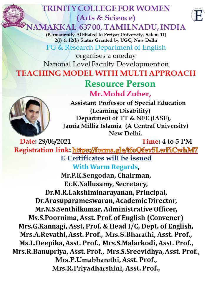 The PG and Research Department of English conducted an online virtual event in the title of “FDP – Teaching Model with multi approach” on 29th June 2021. Mr. Mohd Zuber, Assistant Professor of Special Education (Learning Disability), Department of TT & NEF (IASE), Jamia Millia Islamia (A Central University), New Delhi was the resource person. Multi model learning in education is very important for our current generation students, he said. Beside that he explained the various modes are channels of information such as Audio, Speech, Pictures, Illustrations, Music, Movement, Gestures, Colours, Facial Expressions, Writing pen images, etc., Listening, Speaking, Reading and Writing are the important skills for each and every teachers, he insisted.