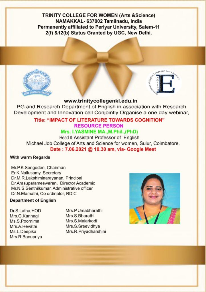 The PG & Research Department of English in association with RDIC, Trinity College for Women, Namakkal organized a webinar event entitled “Impact of literature towards cognition” on 07th June 2021. Mrs. I. Yasmine, Assistant Professor and Head, Department of English, Michael Job College of Arts and Science for Women, Sulur, Coimbatore District was the special invitee of that webinar. Ameliorating and Improving the teaching and learning of English and the language arts at all levels of education. It is very essential for all learners; she highlighted the importance of English. In addition to she explicated the sub themes of literature like critical theory, creative writing, theory & pedagogy, rhetoric composition, linguistics, literature, literacy, reading theory, etc.,