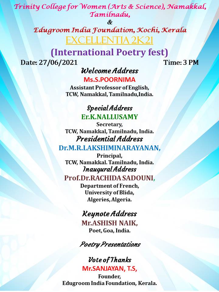 Our Trinity College for Women (Arts and Science), Namakkal and Edugroom India Foundation, Kochi, Kerala jointly organized a one day International Poetry Fest (Excellentia 2K21) on 27th June 2021 (Sunday) @ 3 PM.