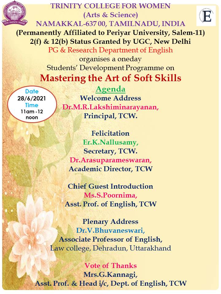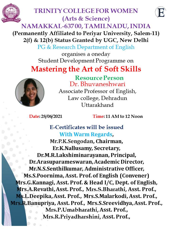 The PG and Research Department of English of Trinity College for Women, Namakkal conducted a webinar event in the title of “Mastering the Art of Soft Skills” on 28th June 2021. Dr. V. Bhuvaneswari, Associate Professor in English, Law College, Dehradun, Uttarakhand state was the invited speaker.