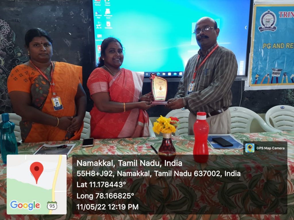 நாமக்கல் – டிரினிடி மகளிர் கலை மற்றும் அறிவியல் கல்லூரியின் மூன்றாம் ஆண்டு இளநிலை ஆங்கிலம் பாடப்பிரிவு படித்து வரும் மாணவி ஏ கோகுலப்ரியா பல்வேறு தமிழ் தொடர்பான விருதுகள் பெற்றமைக்கு பாராட்டு விழா 20.09.2021 அன்று கல்லூரி வளாகத்தில் நடைபெற்றது .