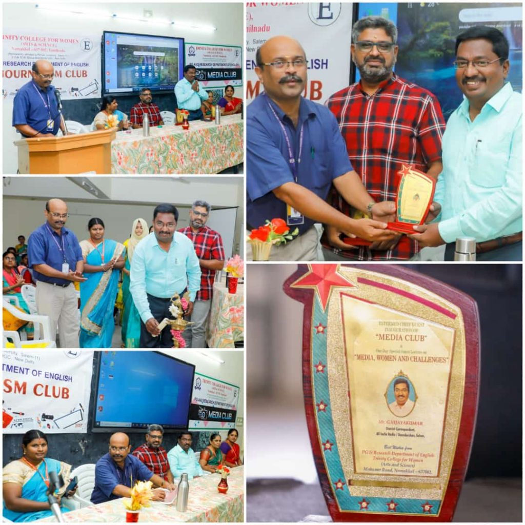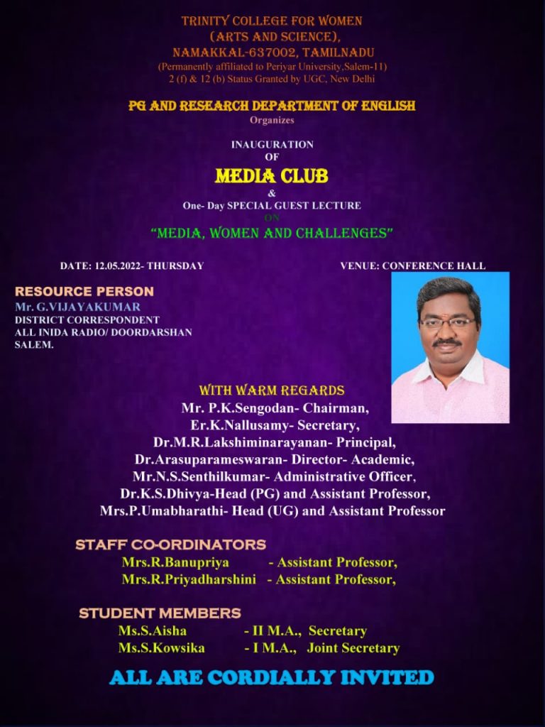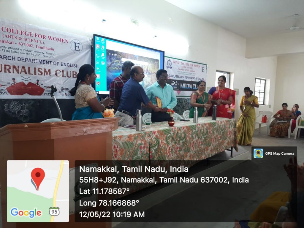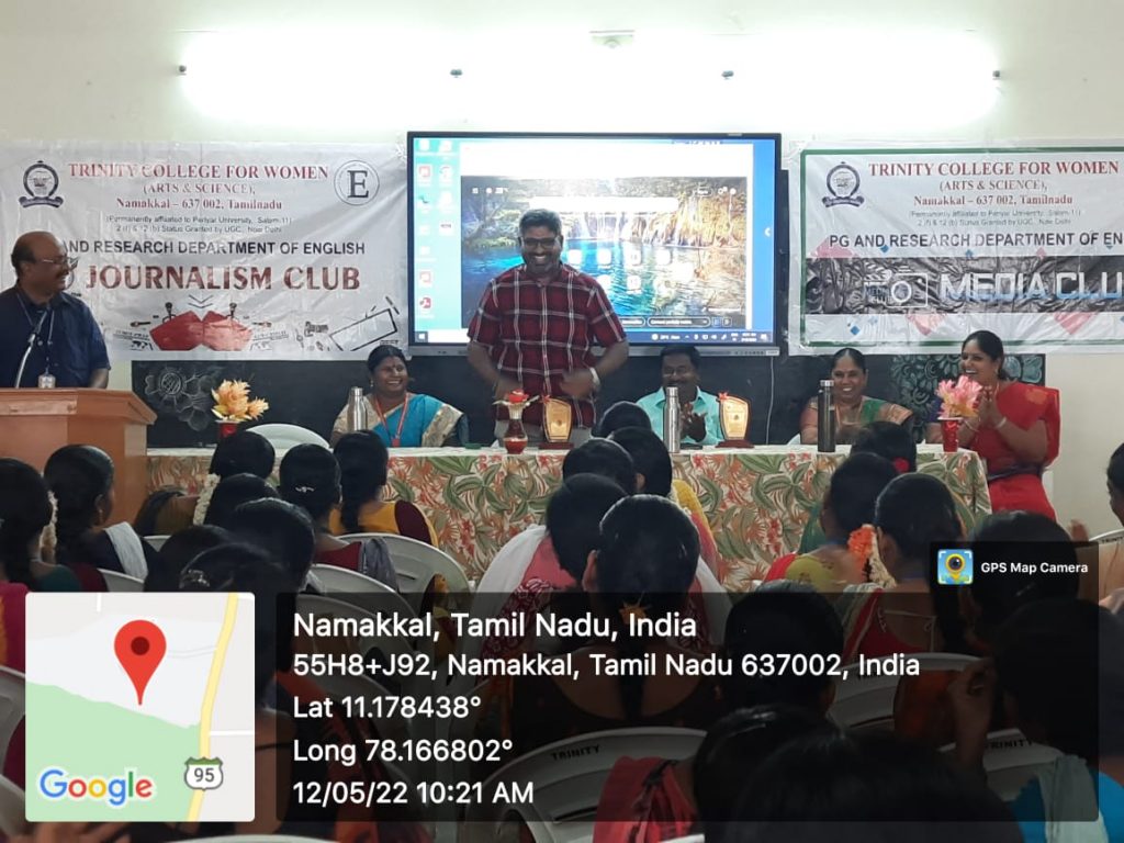 · The Post Graduate and Research Department of English, Trinity College for Women, Namakkal established the Media Club on 12.05.2022. Mr. G Vijayakumar, District Correspondent, All India Radio & Doordarshan, Salem was the resource person and he talked about the topic of “Media, Women and Challenges”. Media, it is printed paper to digital data, and encloses art, news, educational content and numerous other forms of information. Media is a part of our lives, he indicated. Besides, he explained women’s role for our healthy society and their challenges in day to day life.