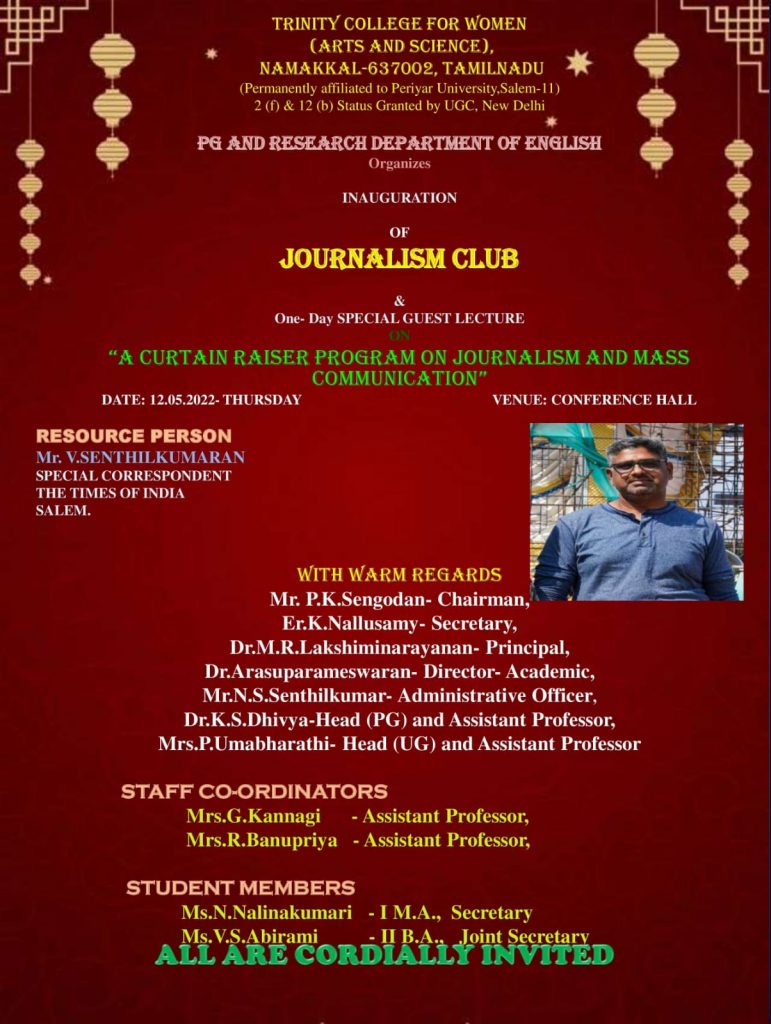 The inauguration function of Journalism Club was held on 12.05.2022 in the mini seminar hall of Trinity College for Women, Namakkal. Mr. V Senthilkumaran, Special Correspondent, The Times of India, Salem was the chief guest and he spoke on the topic of “A curtain Raiser Programme on Journalism and Mass Communication”. Journalism is fact based reporting of current events. Journalists report through Television, Radio, Newspapers, Magazine, Social Medias and the Internet. Journalism requires research thoroughness and the ability to write unmistakably, clearly and succinctly, he designated.