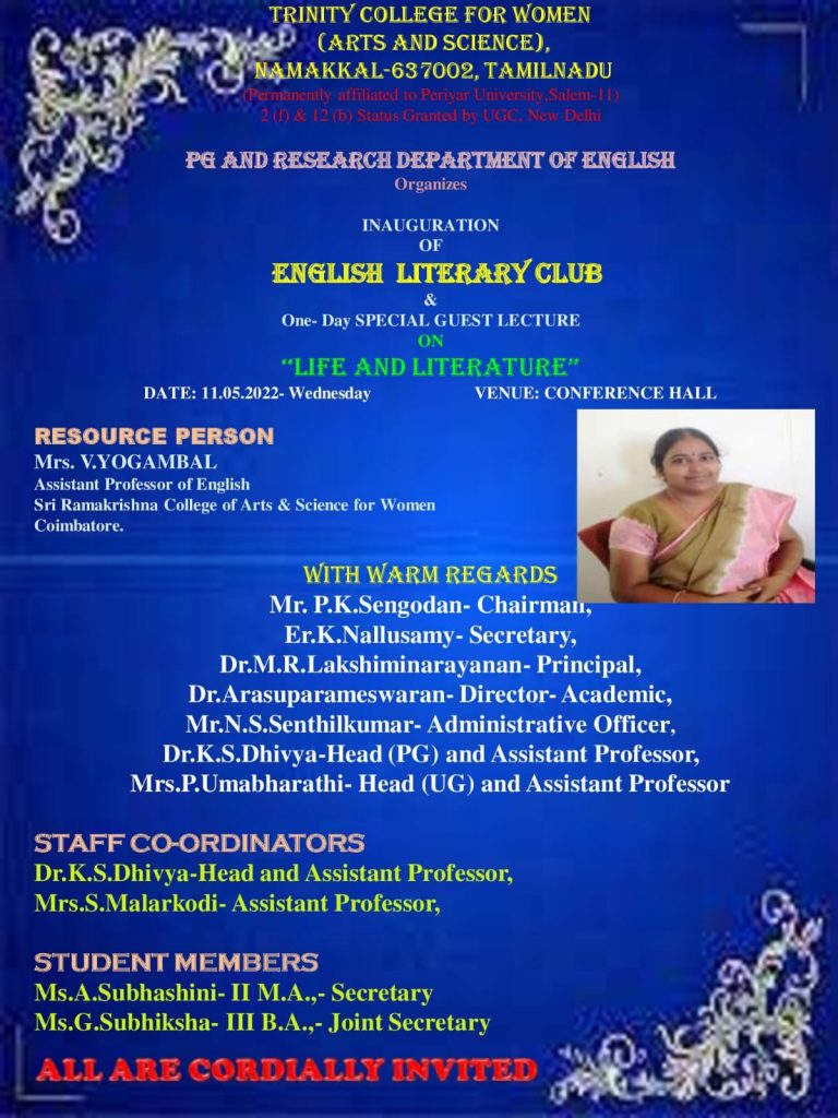 · The Post Graduate and Research Department of English, Trinity College for Women, Namakkal inaugurated the English Communication Club and English Literary Club on 11.05.2022. Mrs. V. Yogambal, Assistant Professor in English, Sri Ramakrishna College of Arts and Science for Women, New Sidhapudur, Coimbatore was inaugurated the both the club of English Department. She spoke on the topics of “Orators for Life and Life & Literature. Orator skill is an art of public speaking particularly correctly, formally and eloquently. It is so foremost that it assists in deciding factors in many things like career, development, business growth and even to help preserve good relationships between friends and family, she said. Literature is the base of life. The connection between literature and life is both important and essential. Especially literature has a deep and direct link with human life and its realities, she denoted.