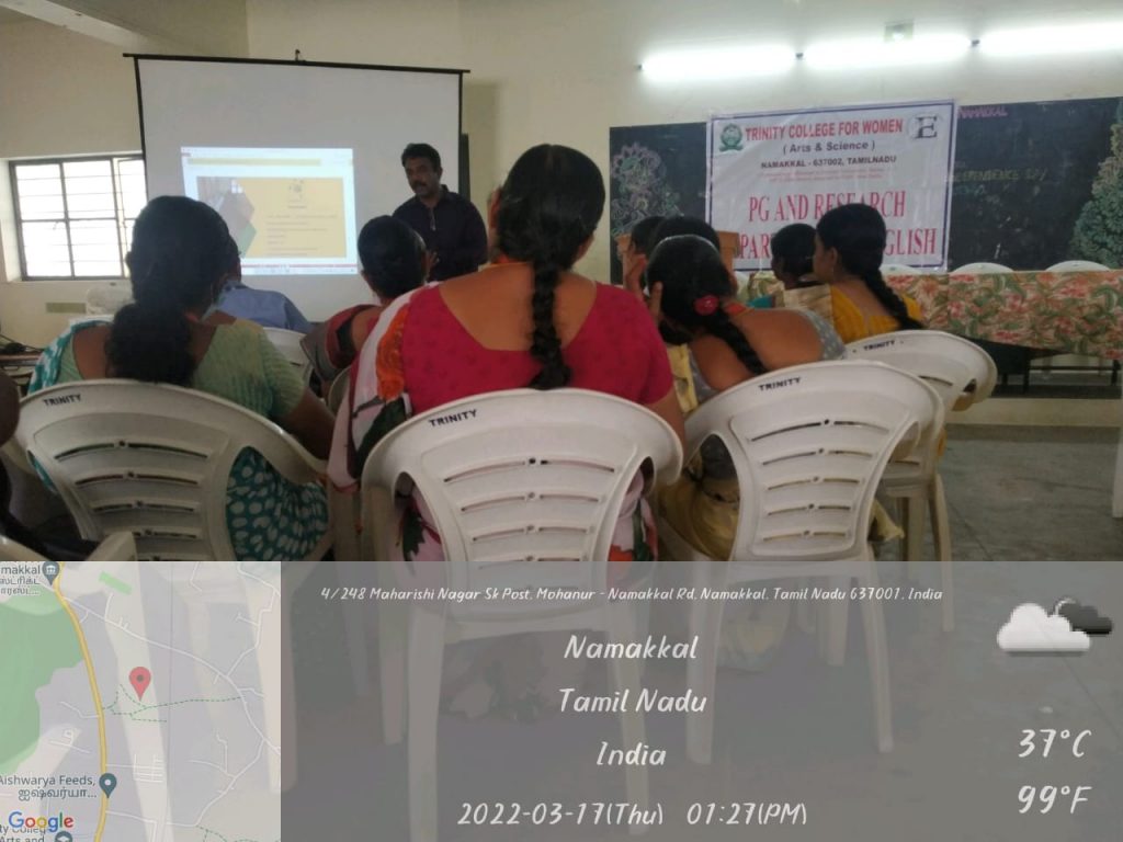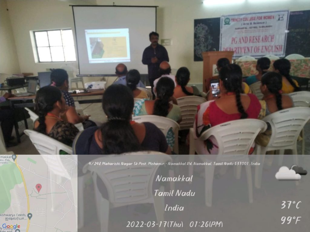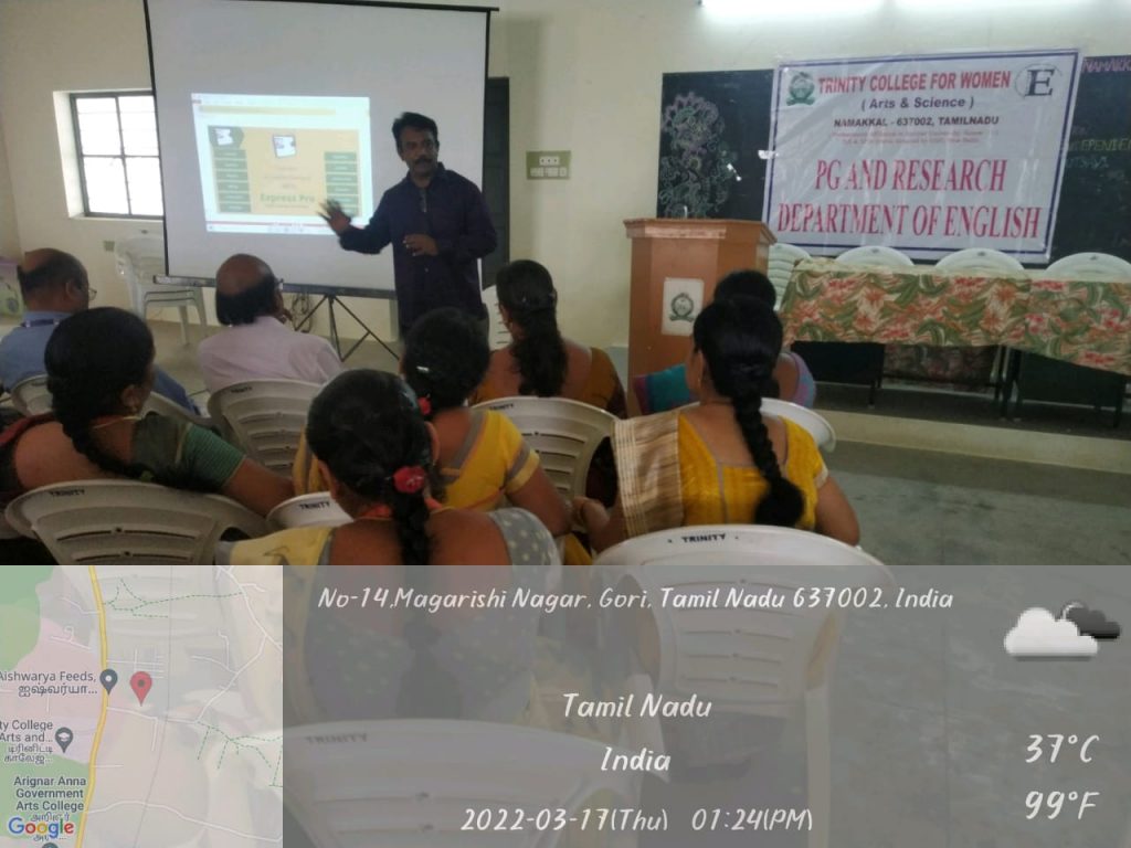 The Post Graduate and Research Department of English, Trinity College for Women (Arts and Science), Namakkal organized a one day workshop entitled “The making use of digital media to improve teaching and learning English” on 17th March 2022. It was held in the premises of a mini seminar hall. Mr. S.J. Sureshkumar, S-Tech, 44, TSN Avenue, I Phase, Airport, Trichirappalli was the invited speaker. Digital learning empowers our efficiency and productivity. Especially, English communication lab is especially important for online learning for the sake of students. It helps in learning the basic skills including the soft skills (LSRW) and English language. It is one of the modern methods of multinational level pedagogy, he denoted. Mr. S.J. Sureshkumar, S- Tech also spoke on that occasion.
