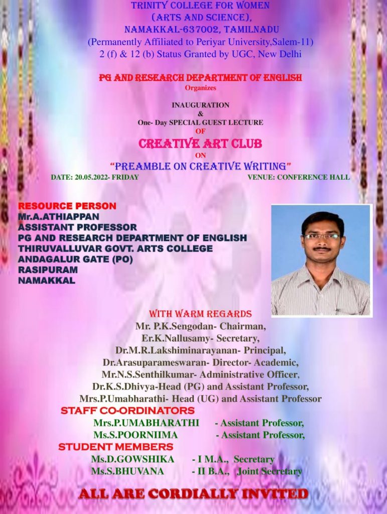 Mr. A. Athiyappan, Assistant Professor in English, Thiruvalluvar Government Arts College, Rasipuram, Namakkal district inaugurated the Creative Art Club on 20.05.2022. Apart from that, he spoke on the topic of “Preamble on creative writing”. He elaborated the illustrations of some creating writing in the areas of novel writing, plays, memoirs, poetry, short stories, flash fiction, song lyrics, television and film scripts. Dr M.R. Lakshiminarayanan, Principal of the College welcomed the gathering. Mr. P.K. Sengodan, Chairman of the College, presided over the programme. Er. K. Nallusamy, Secretary of the College spoke about the importance of English creative writing. Dr.Arasuparameswaran, Director – Academic offered his felicitation address.