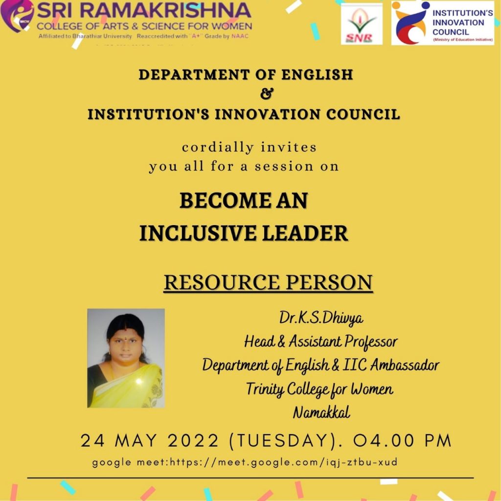 Dr K. S. Dhivya, Assistant Professor and HoD of PG English, Trinity College for Women, Namakkal delivered on the topic of “Become an inclusive leader” on 24.05.2022. This programme was organized by the department of English & Institution’s Innovation Cell of Sri Ramakrishna College of Arts and Science for Women, New Sidhapudur, Coimbatore.