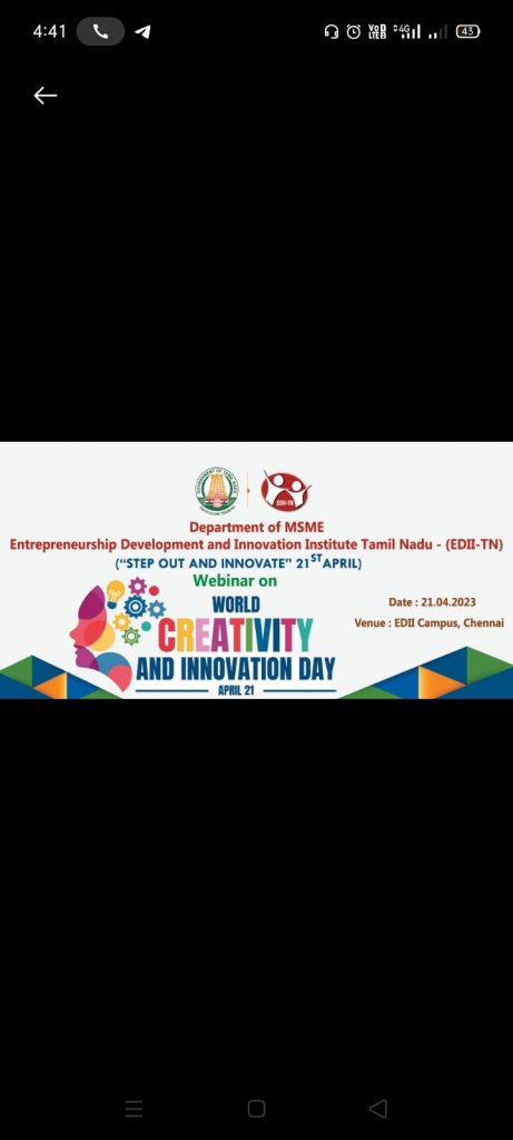 Entrepreneurship Development and Innovation Institute (EDII) (தொழில்முனைவோர் மேம்பாடு மற்றும் புத்தாக்க நிறுவனம்) organized a virtual event in the title of “Step out and innovate” on 21st April 2023. Owing to World Creativity and Innovation Day (April 21), this online event was held.