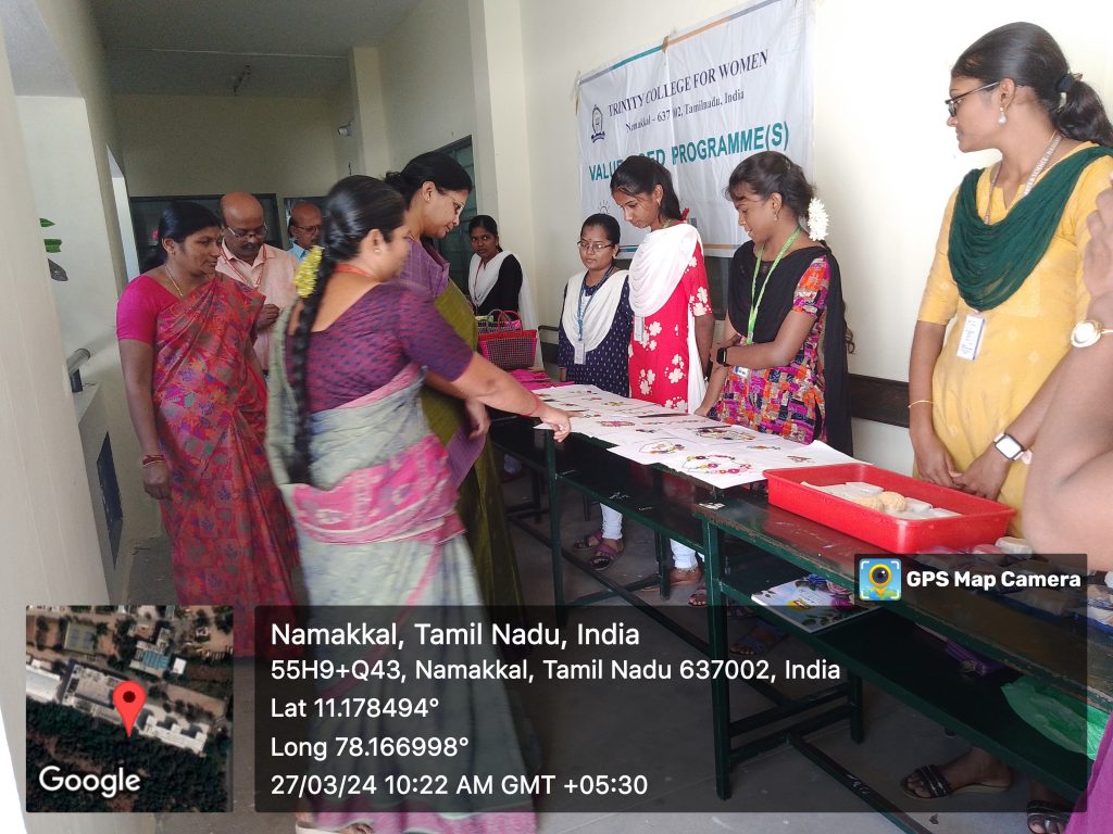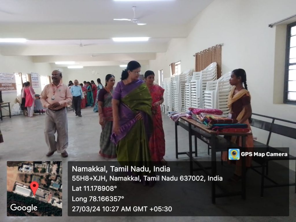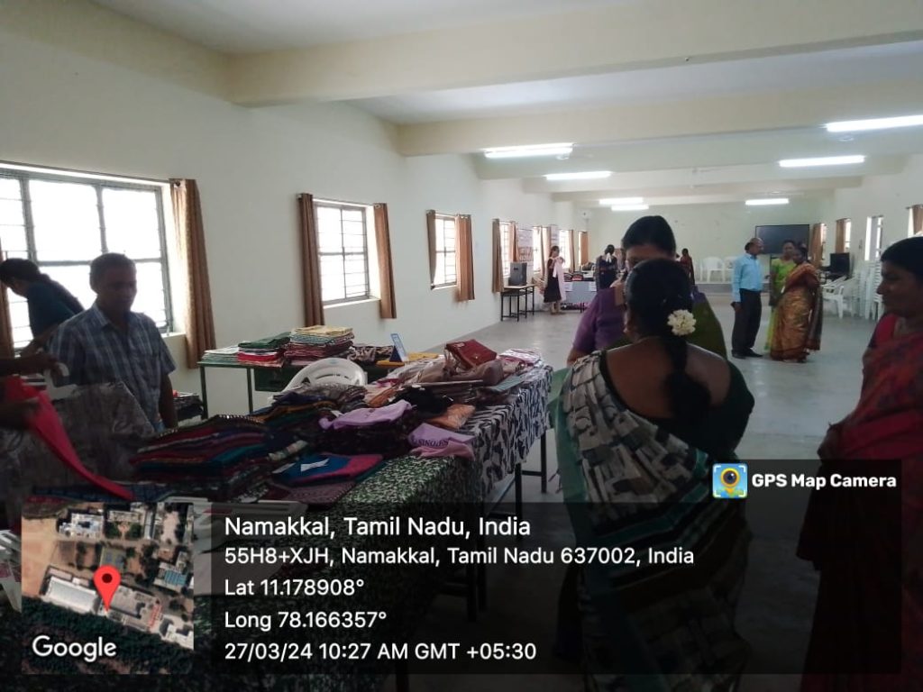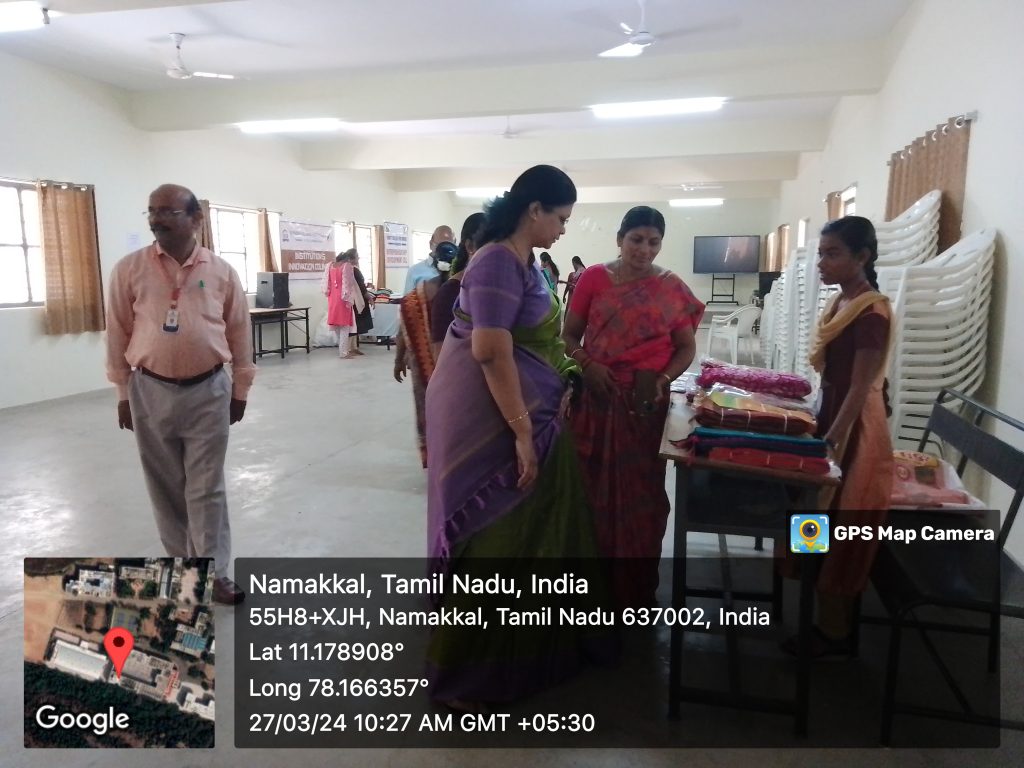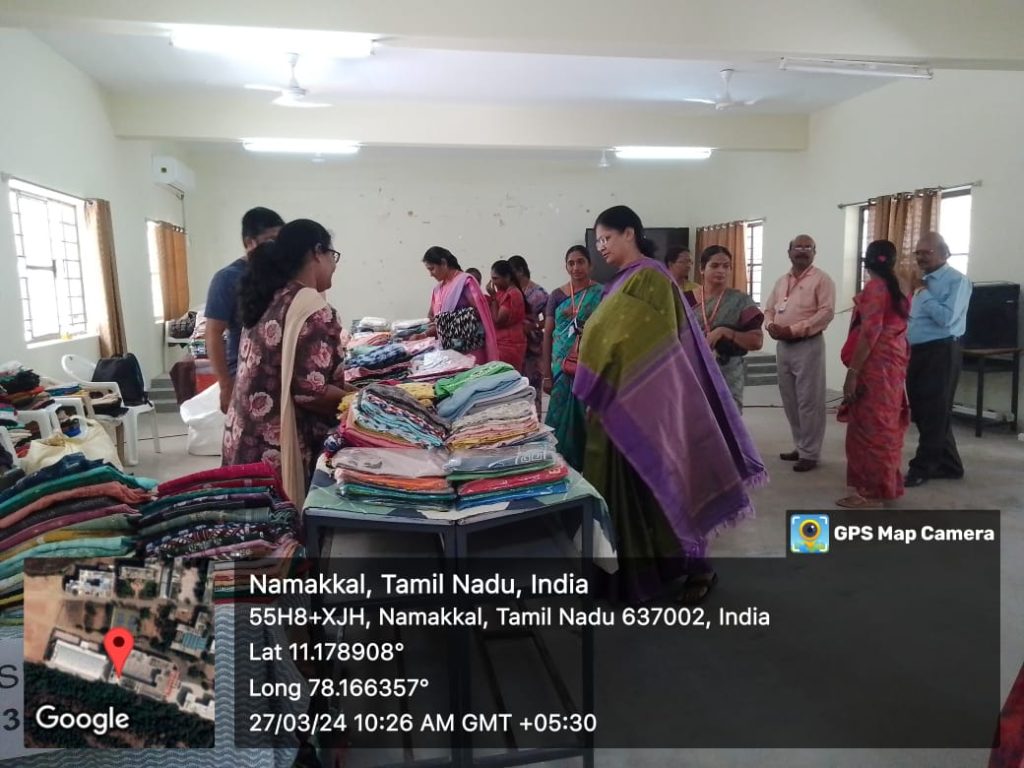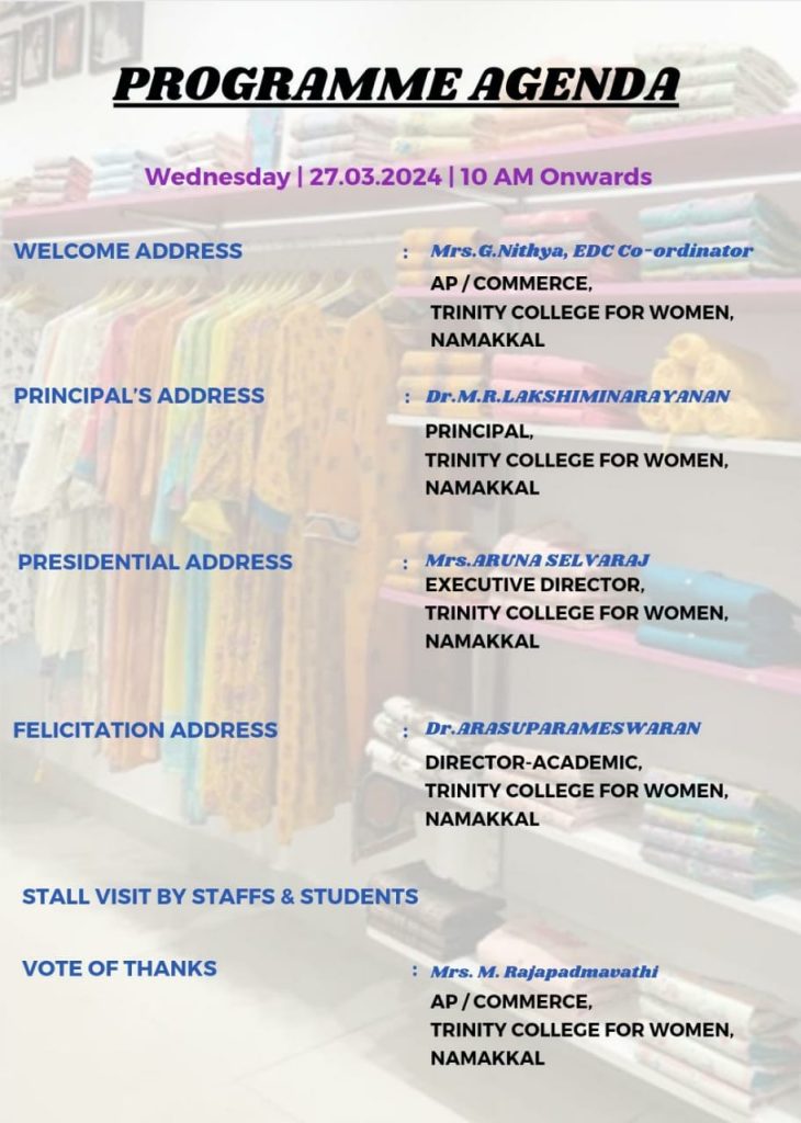 The Entrepreneurship Development Cell, Value Added Programme Cell, Institution’s InnovationCell, In association with the Department of Costume Design and Fashion, Trinity College for Women, Namakkal conducted a start-ups business programme entitled ““Our Trinity College students’, participation in Textile Entrepreneurship” (ஜவுளித் துறையில் தொழில் முனைவோராக எங்கள் டிரினிடி கல்லூரி மாணவியர்) Textile Exhibition cum Sale (ஜவுளி கண்காட்சி மற்றும் விற்பனை) on 27th March 2024 – Wednesday – 10 AM . Mrs. Aruna Selvaraj, Executive Director, Trinity College for Women, Namakkal was the special invitee and she inaugurated the programme.
