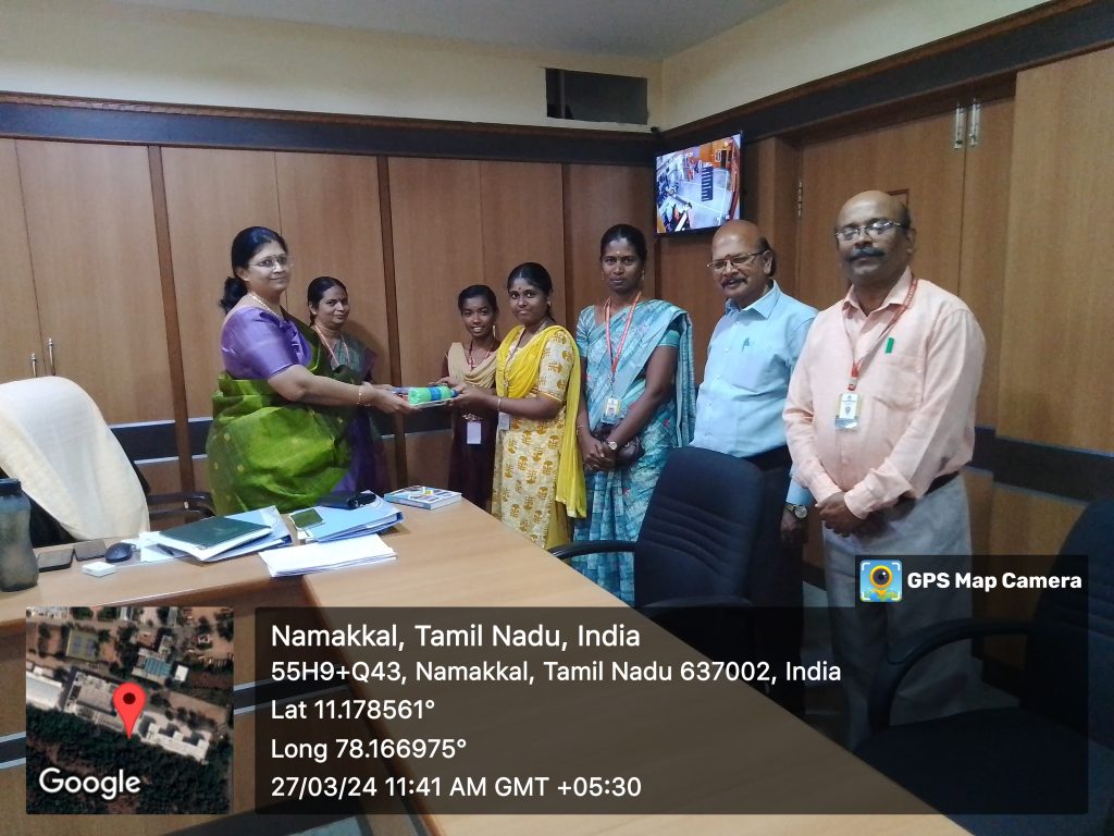 | 03 | Ms. M. Monisha, | 719, Devendhira Street, Siviampalayam, Chidambarampatti Post,Sendamangalam Taluk, Namakkal – 637 405. (Now pursuing first year B.Sc., Chemistry in our College during the academic year 2023-2024 | Sarees, organic soaps & shampoo |