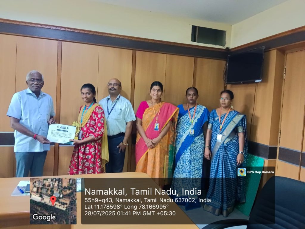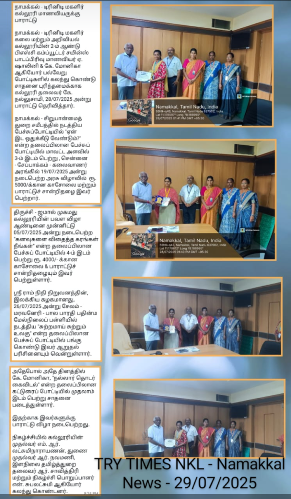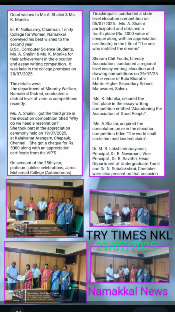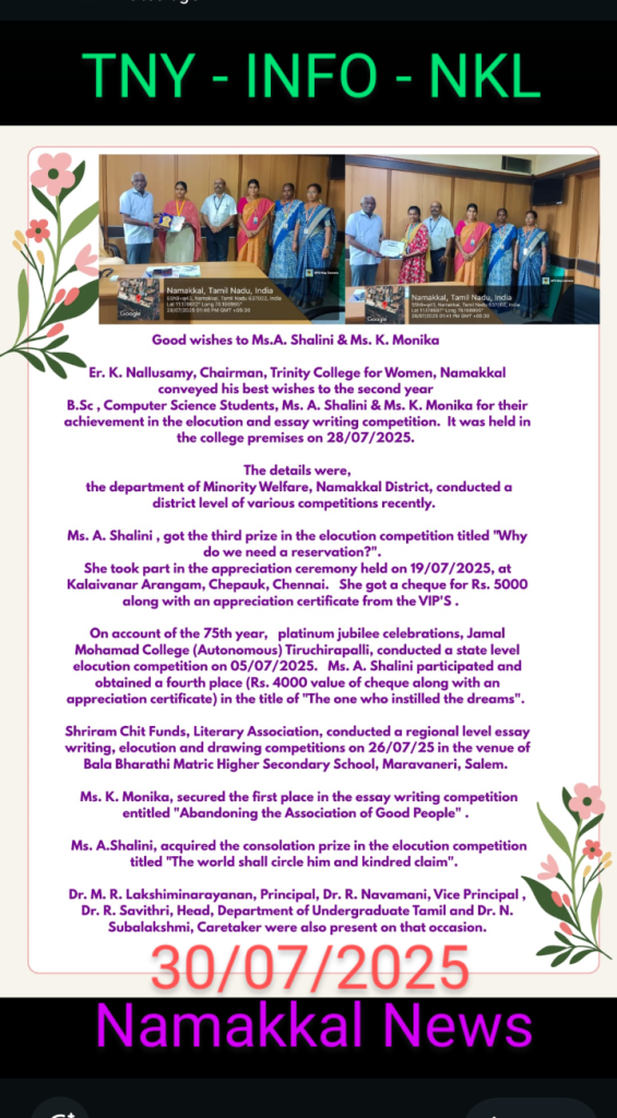 The details were,   the department of Minority Welfare, Namakkal District, conducted a district level of various competitions recently.    Ms. A. Shalini , got the third prize in the elocution competition titled “Why do we need a reservation?”.   She took part in the appreciation ceremony held on 19/07/2025, at Kalaivanar Arangam, Chepauk, Chennai.   She got a cheque for Rs. 5000 along with an appreciation certificate from the VIP’S .
