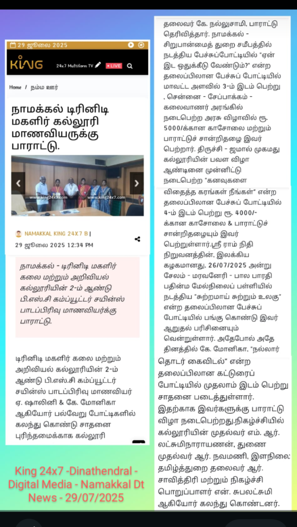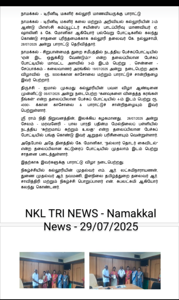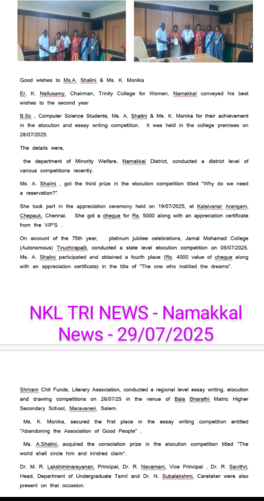 Er. K. Nallusamy, Chairman, Trinity College for Women, Namakkal conveyed his felicitation to the second year B.Sc , Computer Science Students, Ms. A. Shalini & Ms. K. Monika for their achievement in the elocution and essay writing competition.  This appreciation ceremony was held in the college premises on 28/07/2025.