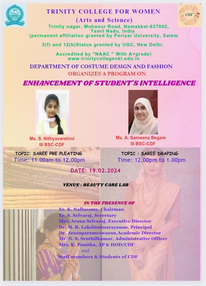 0219.02.24Costume Design and FashionSaree DrapingMs. A. Sameena BegamIII B.Sc., CDFTrinity College for Women, Namakkal