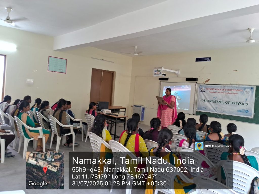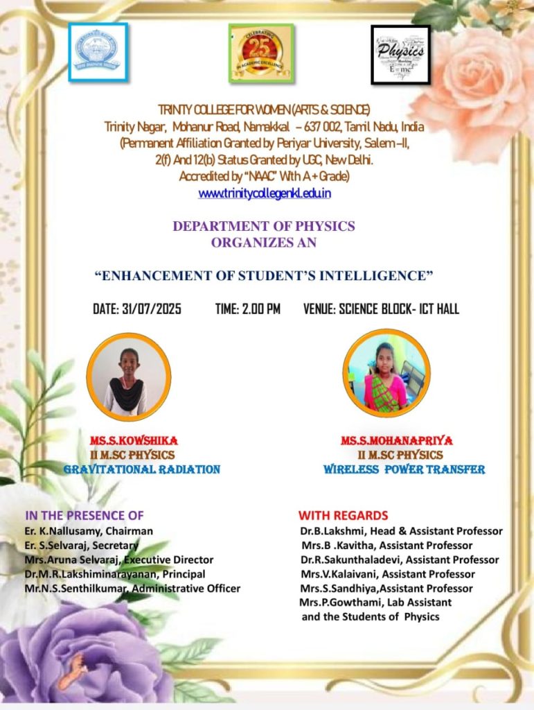 | 02 | 31.07.2025 | Physics | Wireless Power Transfer | Ms. S. MohanapriyaSecond Year M.Sc., PhysicsTrinity College for Women, Namakkal |
