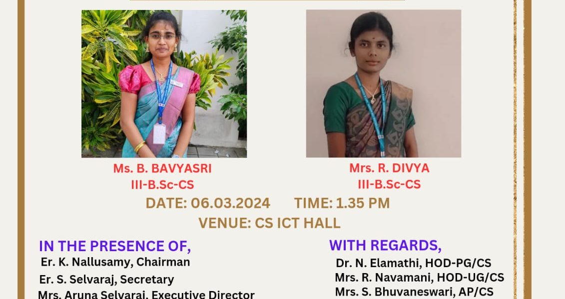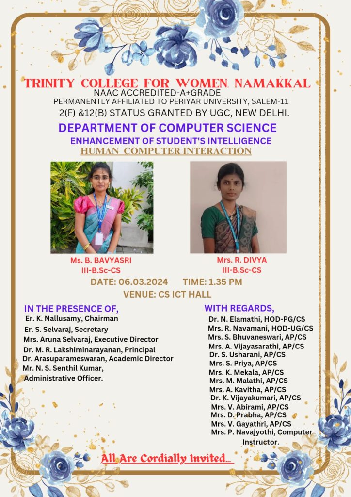 | 01 | 06.03.2024 | Computer Science | Human Computer Interaction | Ms. B. Bavya Sri &Ms. R. Divya, III B.Sc. Computer Science, Trinity College for Women, Namakkal |