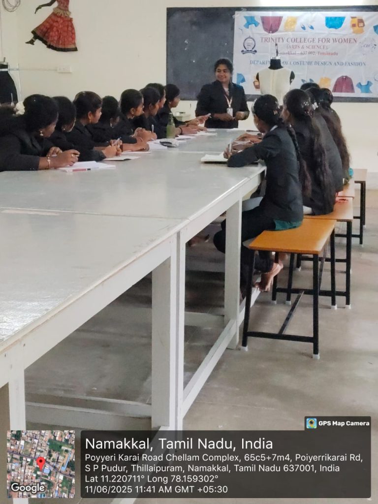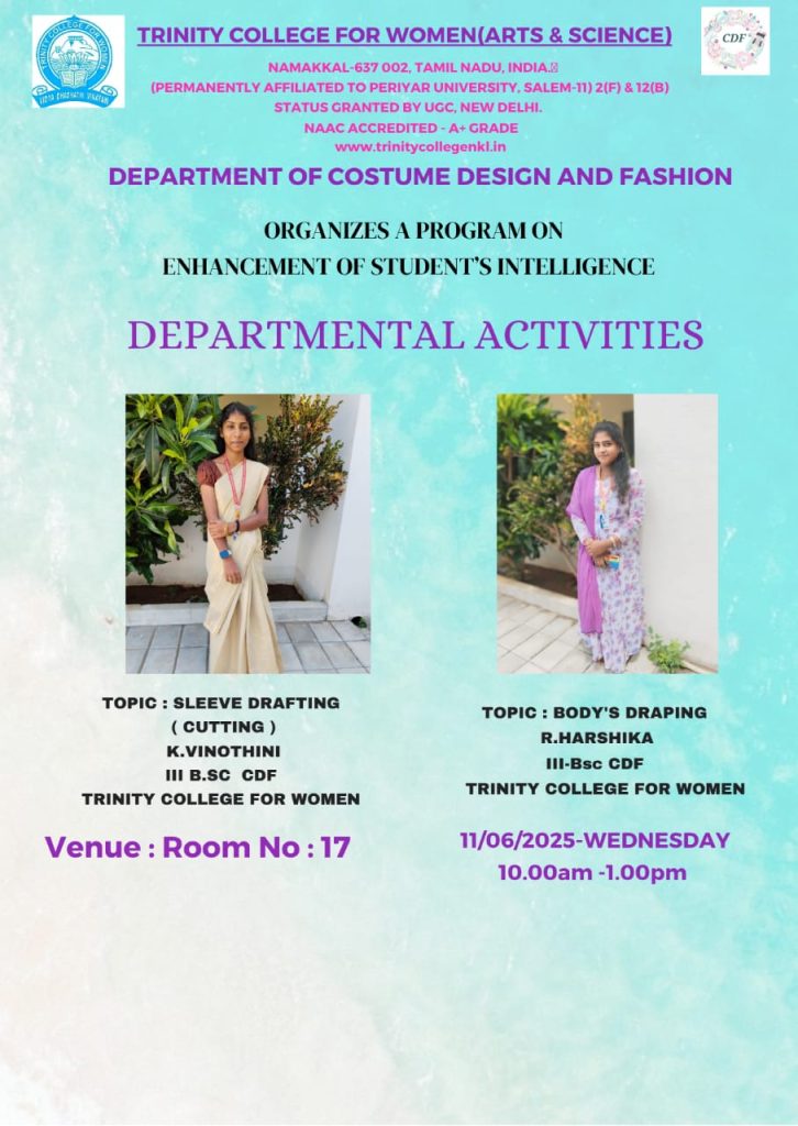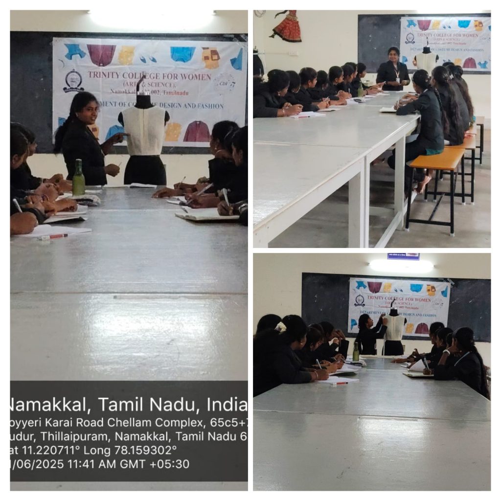 | 02 | 11.06.2025 | Costume Design and Fashion | Body’s Draping | Ms. R. Harshika,Third Year B.Sc., Costume Design and Fashion,Trinity College for Women, Namakkal |