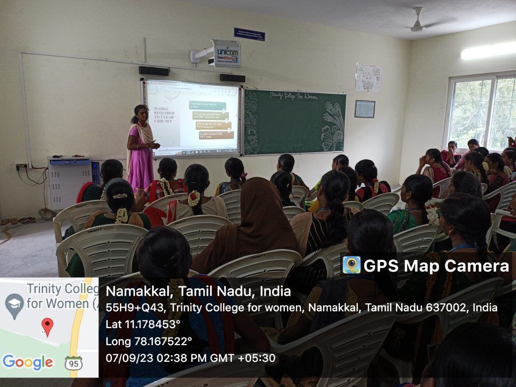 | 02 | 07.09.2023 | Mathematics | An analysis of NET & SET Examinations | Ms. R. Tamilselvi,II M.Sc., Mathematics,Trinity College for Women, Namakkal |