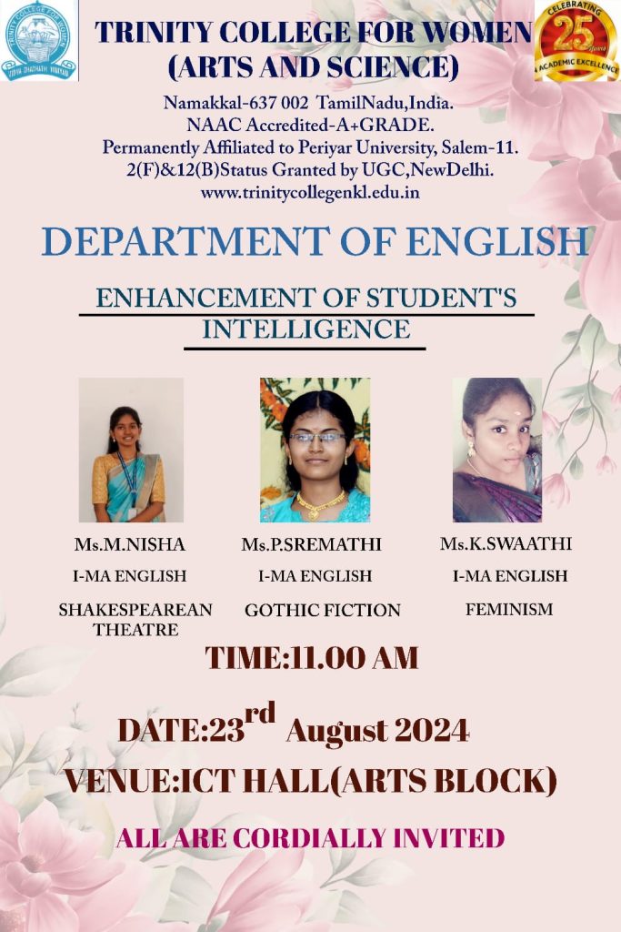 | 01 | 23.08.2024 | English | Shakespearean Theatre | Ms. M. Nisha,First Year M.A., English, Trinity College for Women, Namakkal |
