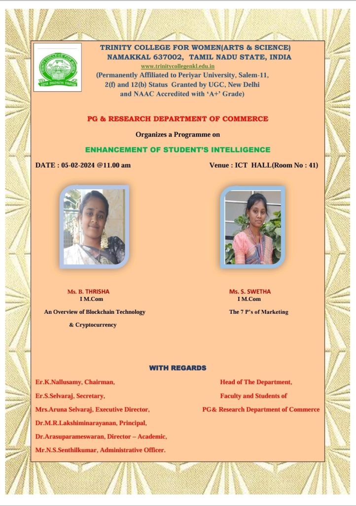 | 01 | 05.02.24 | Commerce | An overview of bluechain technology | Ms. B. Thrisha,First Year M.Com., Trinity College for Women, Namakkal |