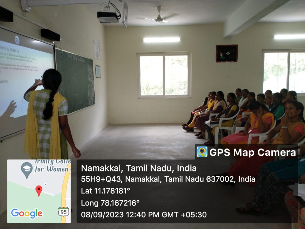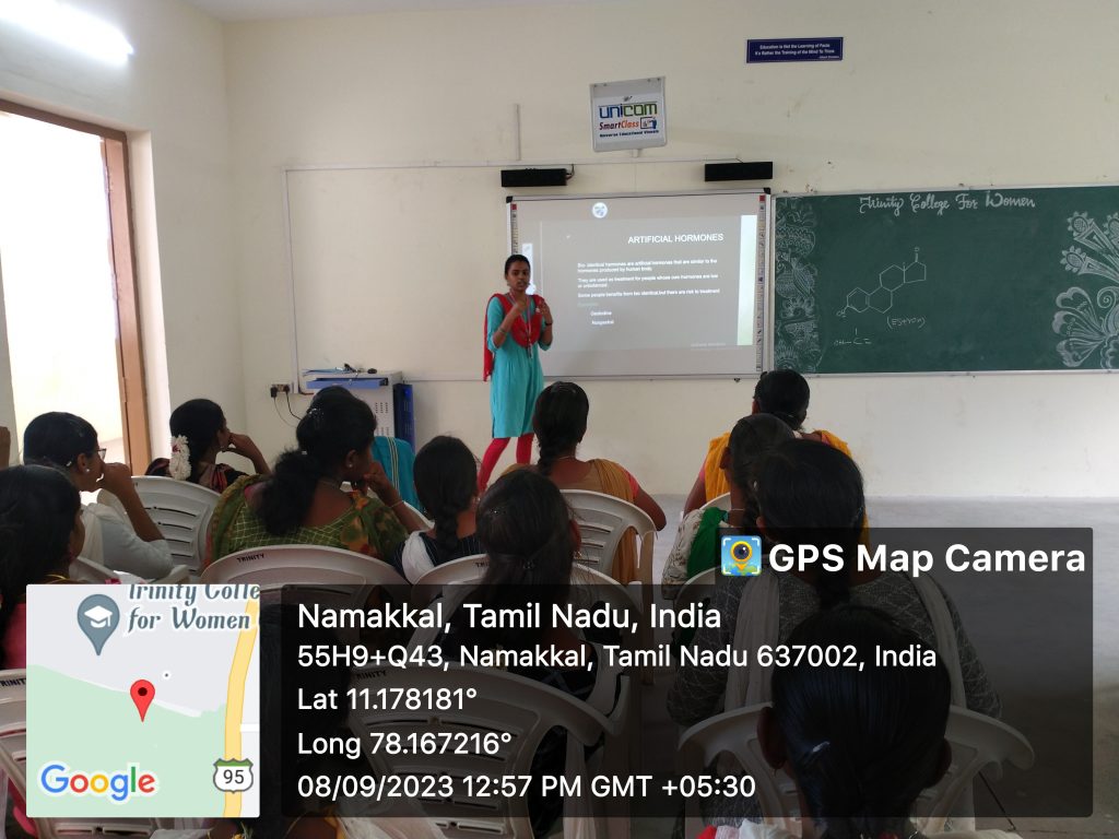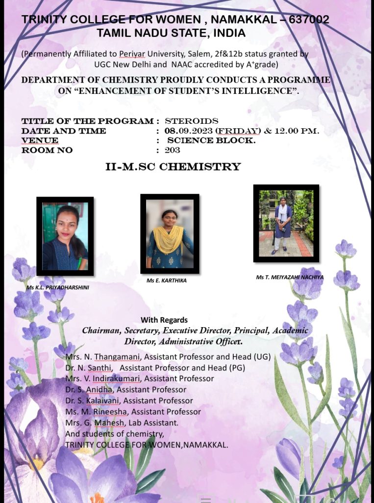 | 01 | 08.09.2023 | Chemistry | Steroids | Ms. K.L. Priyadharshini,Ms. E. Karthika &Ms. T. Meiyazahi Nachiya,II M.Sc., Chemistry,Trinity College for Women, Namakkal |