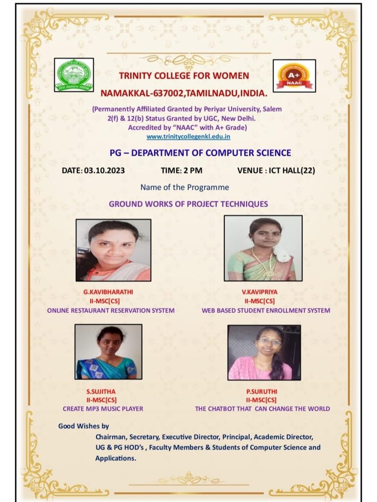 | 02 | 03.10.2023 | Computer Science | Web based student enrolment system | Ms. V. Kavipriya,II M.Sc., Comp. Sci.,Trinity College for Women, Namakkal |