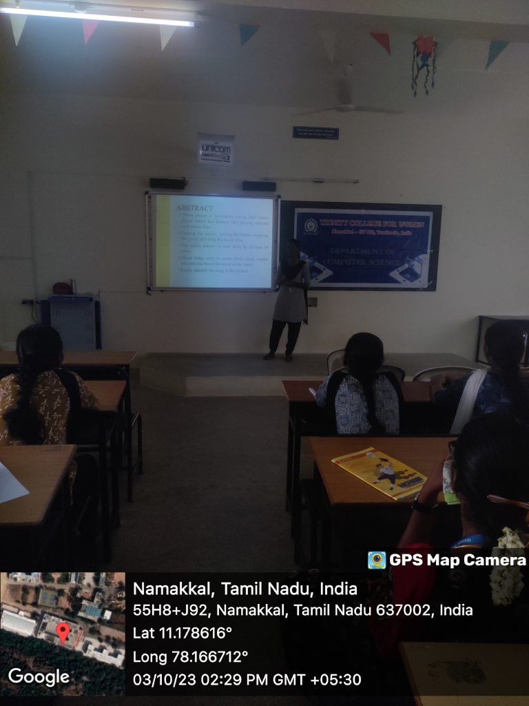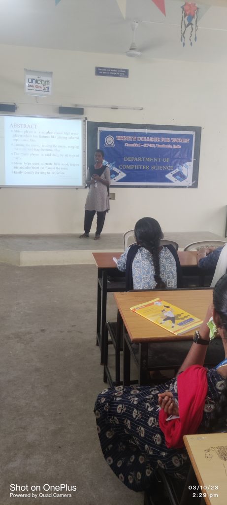 | 03 | 03.10.2023 | Computer Science | Create MP3 Music Player | Ms. S. Sujitha,II M.Sc., Comp. Sci.,Trinity College for Women, Namakkal |